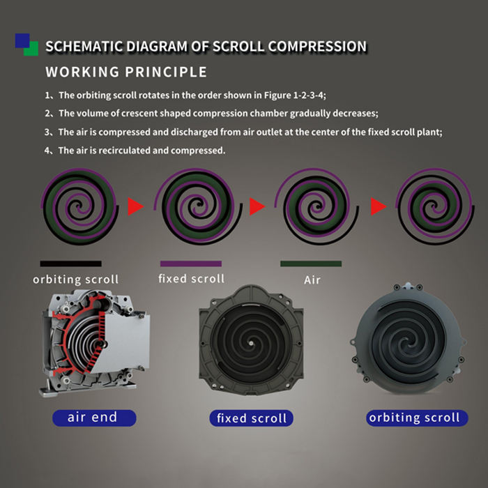 Compresseur d'air à spirale sans huile à aimant permanent 2,2 kW 3 CV, réservoir 5 L, 210 L/min, 8 bars, portable, avec pompe de séchage à membrane polymère PLC