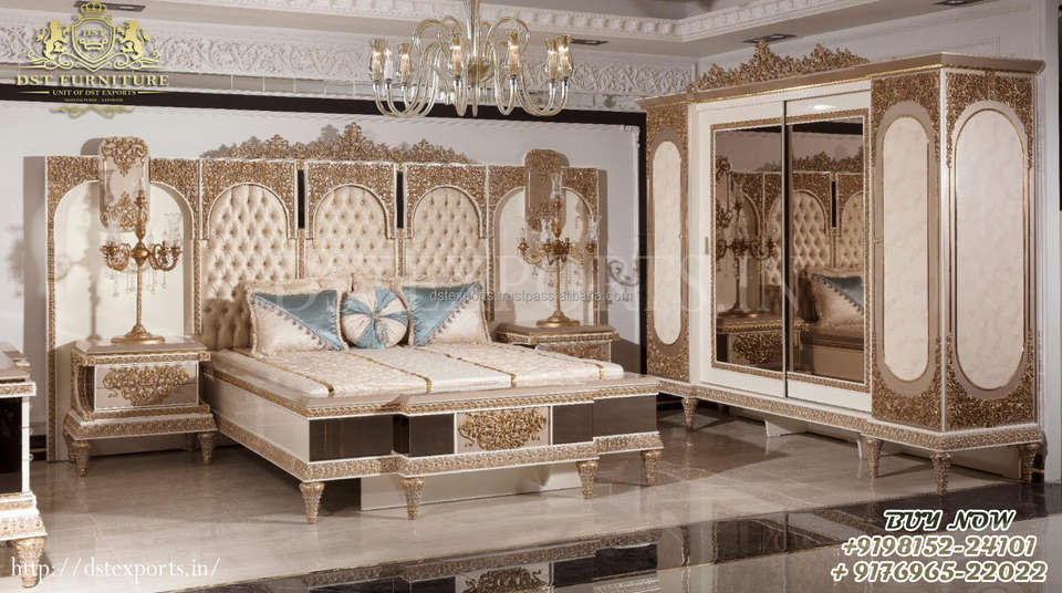 Lit Double King/Queen Size en bois de teck sculpté à la main, tabouret latéral, de Style péruvien, lit de luxe, d'or, sculpté à la main Royal