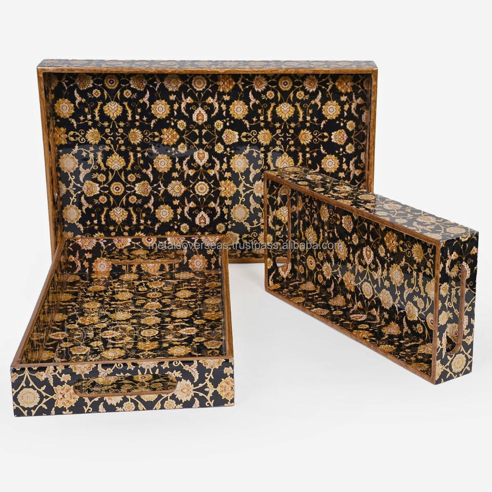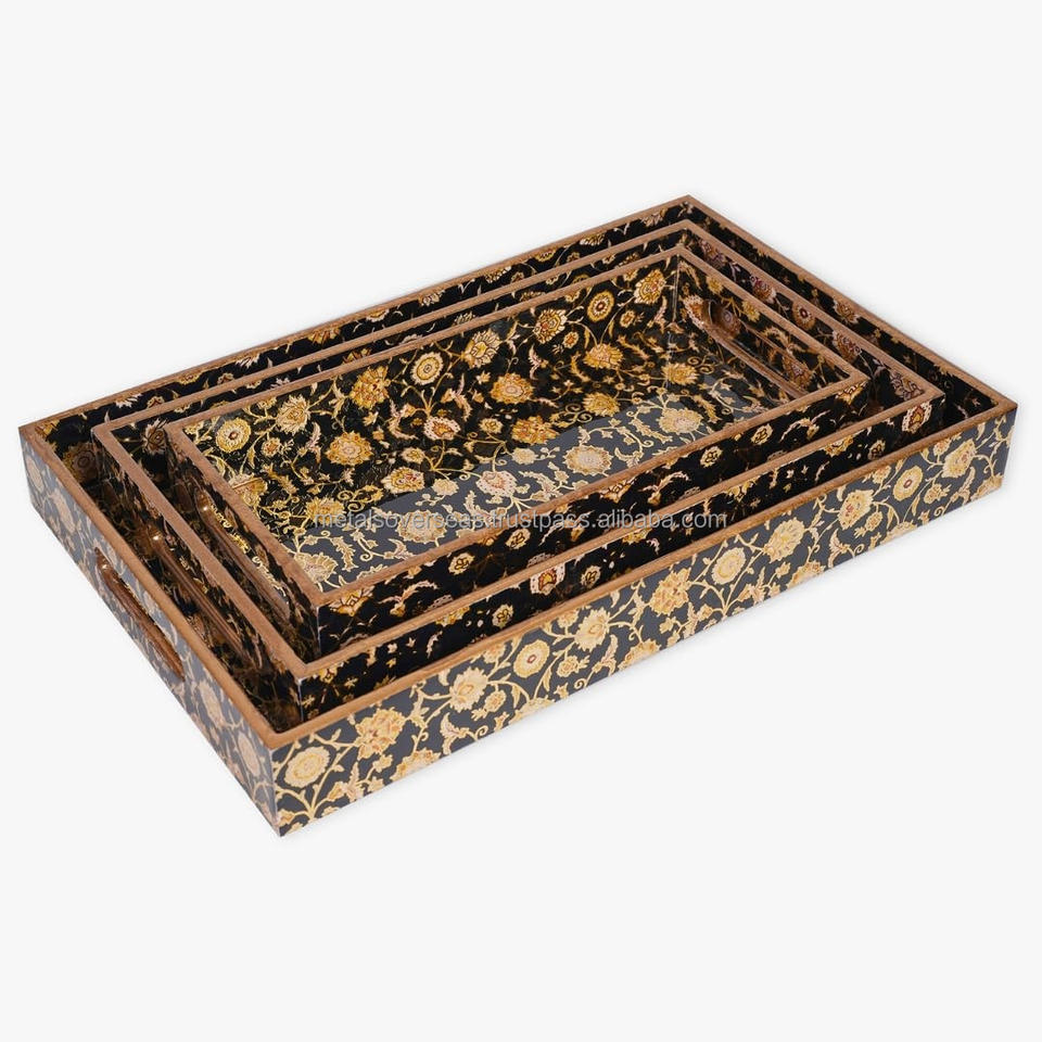 Plateaux de service décoratifs d'inspiration persane avec cadre en bois et accents dorés pour table basse, chambre à coucher et présentoir de vanité