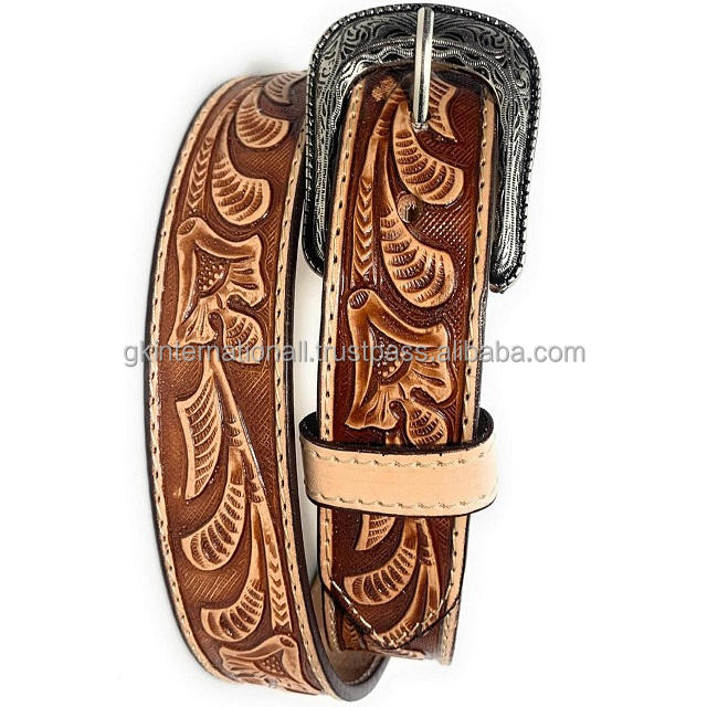 Persoimnailzed Leaf Design ceinture d'outillage en cuir occidental fait main en relief avec boucle ardillon florale en argent antique commande en gros