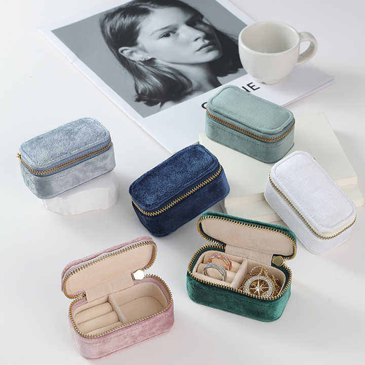 Boîte à bijoux personnalisée avec logo, en velours rose, avec fermeture éclair, mini, de luxe, anti-poussière, pour voyage, pour ranger les bagues