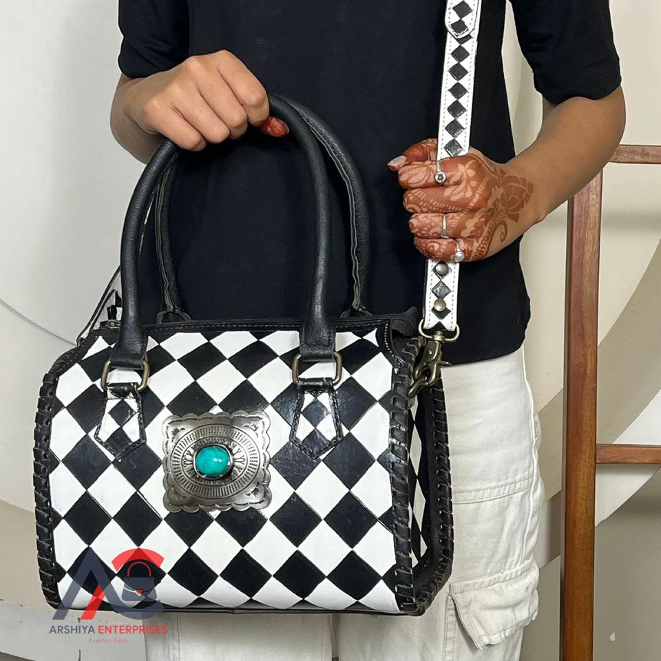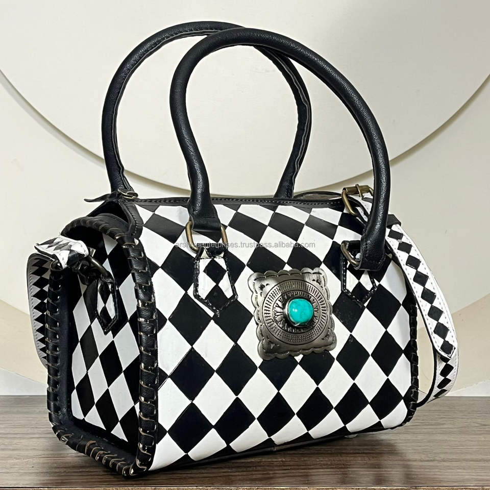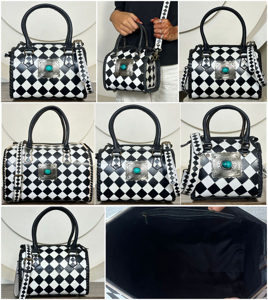 Sac Speedy personnalisé 2026 en cuir de vachette véritable fait main avec concho turquoise et motif à carreaux de créateur, unisexe
