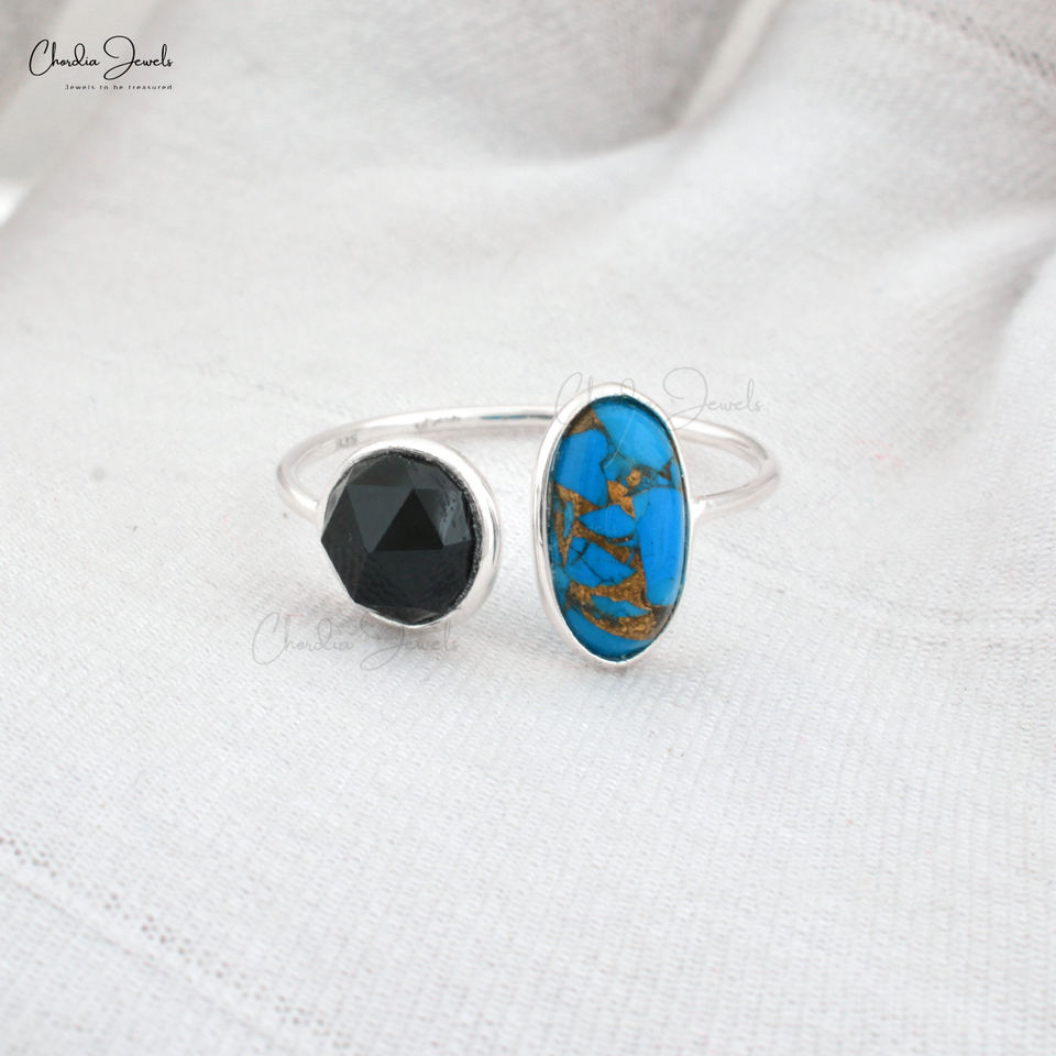 Bague de doigt manchette ouverte en argent sterling 925 Personnalité réglable Top Bague de promesse à deux pierres du fabricant Turquoise Onyx noir