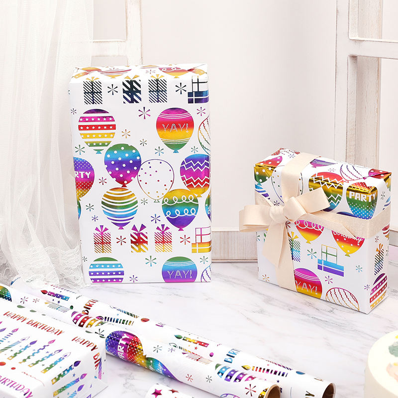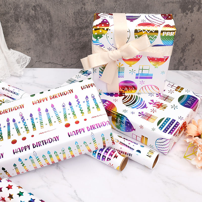 Rouleau de papier d'emballage d'anniversaire d'estampage de papier cadeau de luxe personnalisé de 80g avec logo de marque personnalisé pour emballage