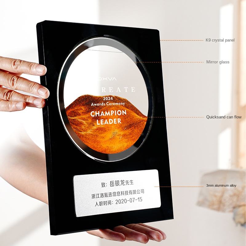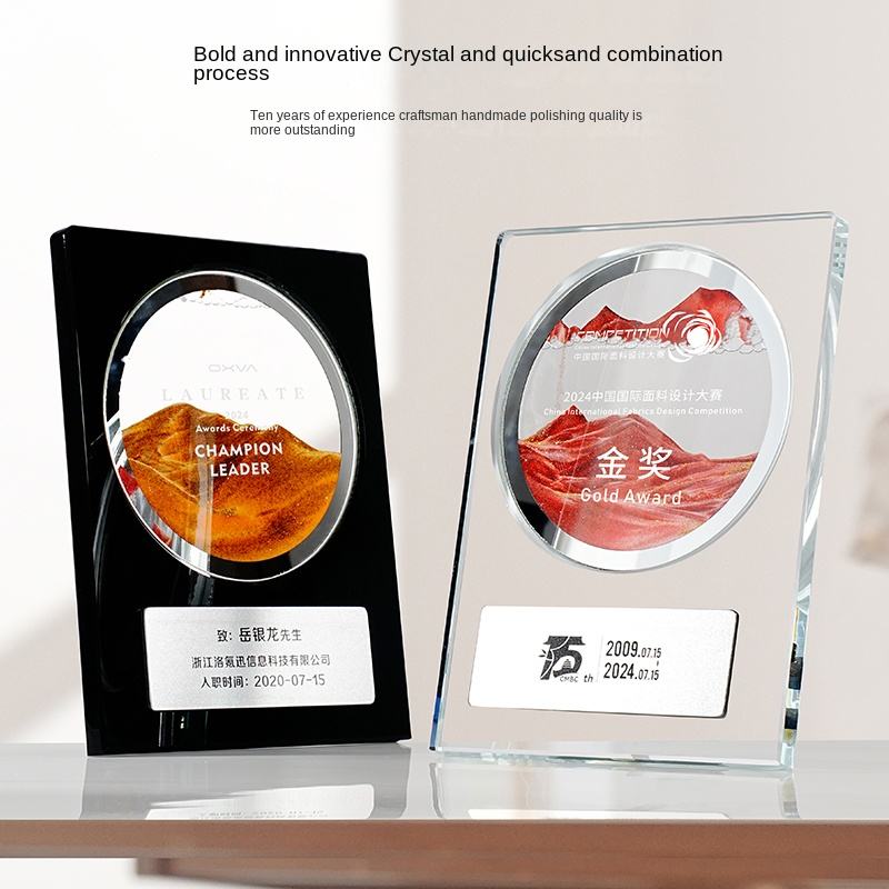 Médaille de récompense en cristal personnalisée - Design créatif de sable mouvant | Trophée de concessionnaire de plaques d'immatriculation imprimées en UV