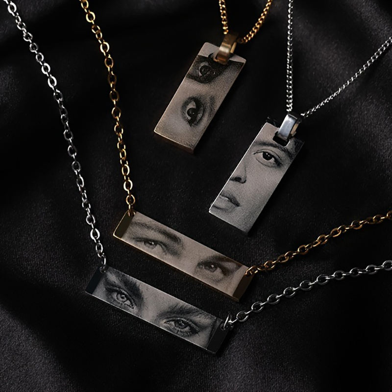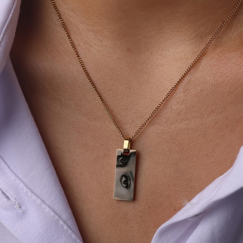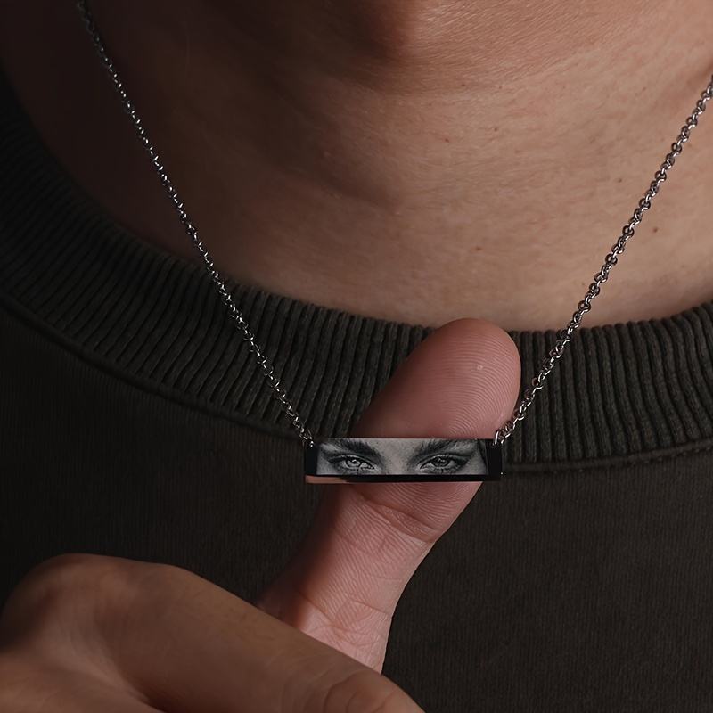 Collier Personnalisé avec Nom Gravé, Photos d'Yeux Géométriques, Longs Pendentifs en Acier Inoxydable pour Femmes et Hommes