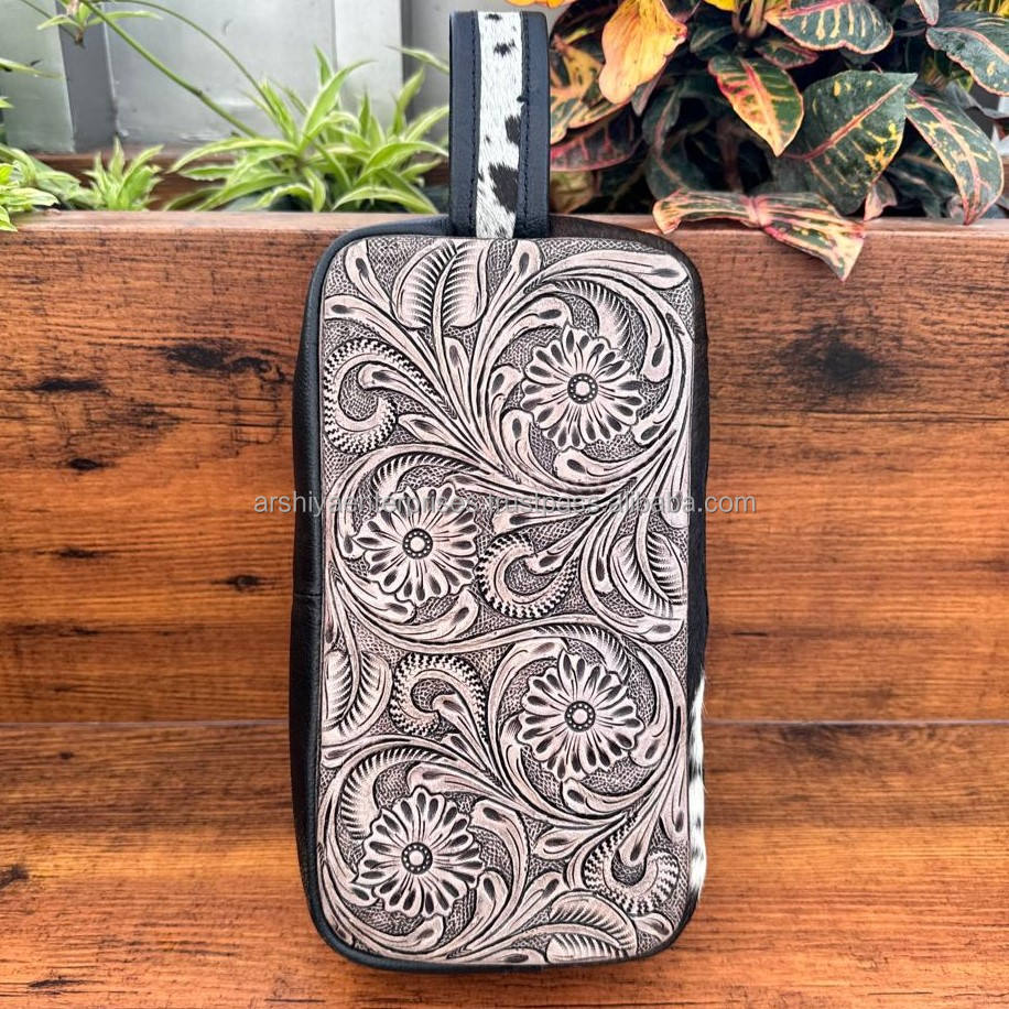 Trousse à cosmétiques personnalisée en cuir usiné avec fermeture éclair Trousse de toilette de voyage occidentale pour les trousses Dopp en cuir véritable pour femmes