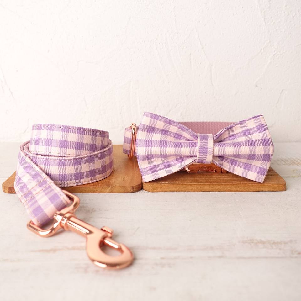 Ensemble collier et laisse pour chien personnalisé, gravé à la main, à carreaux violets