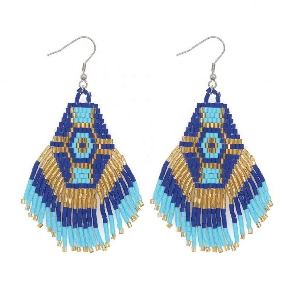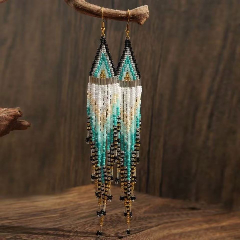 Boucles d'oreilles pendantes personnalisées, tissées à la main, avec perles de riz et pompons, au design de niche européen-américain et de style ethnique ouest-asiatien classique