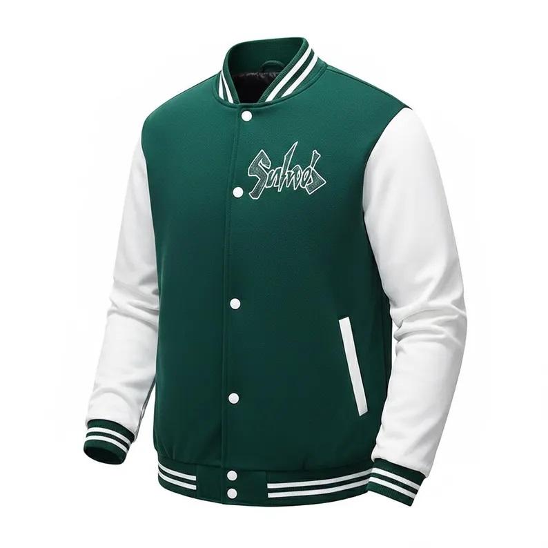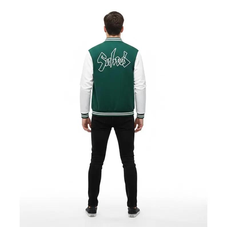 Veste de baseball personnalisée verte et blanche - Veste universitaire brodée sur mesure - Veste bomber unisexe à col montant