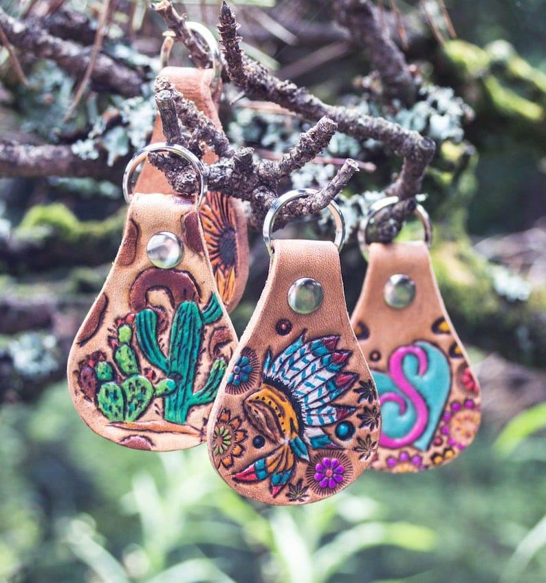 Porte-clés personnalisé en cuir repoussé à la main motifs cowboy wild west et accents aztèques lanière porte-clés en cuir personnalisé floral
