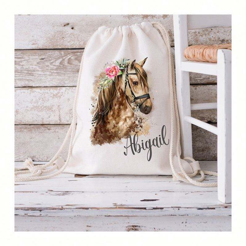 Sac à cordon personnalisé avec motif cheval pour enfants, idéal pour l'école, la gym, la natation, la maternelle, avec nom et design sur mesure