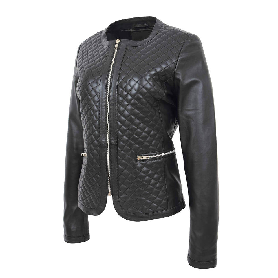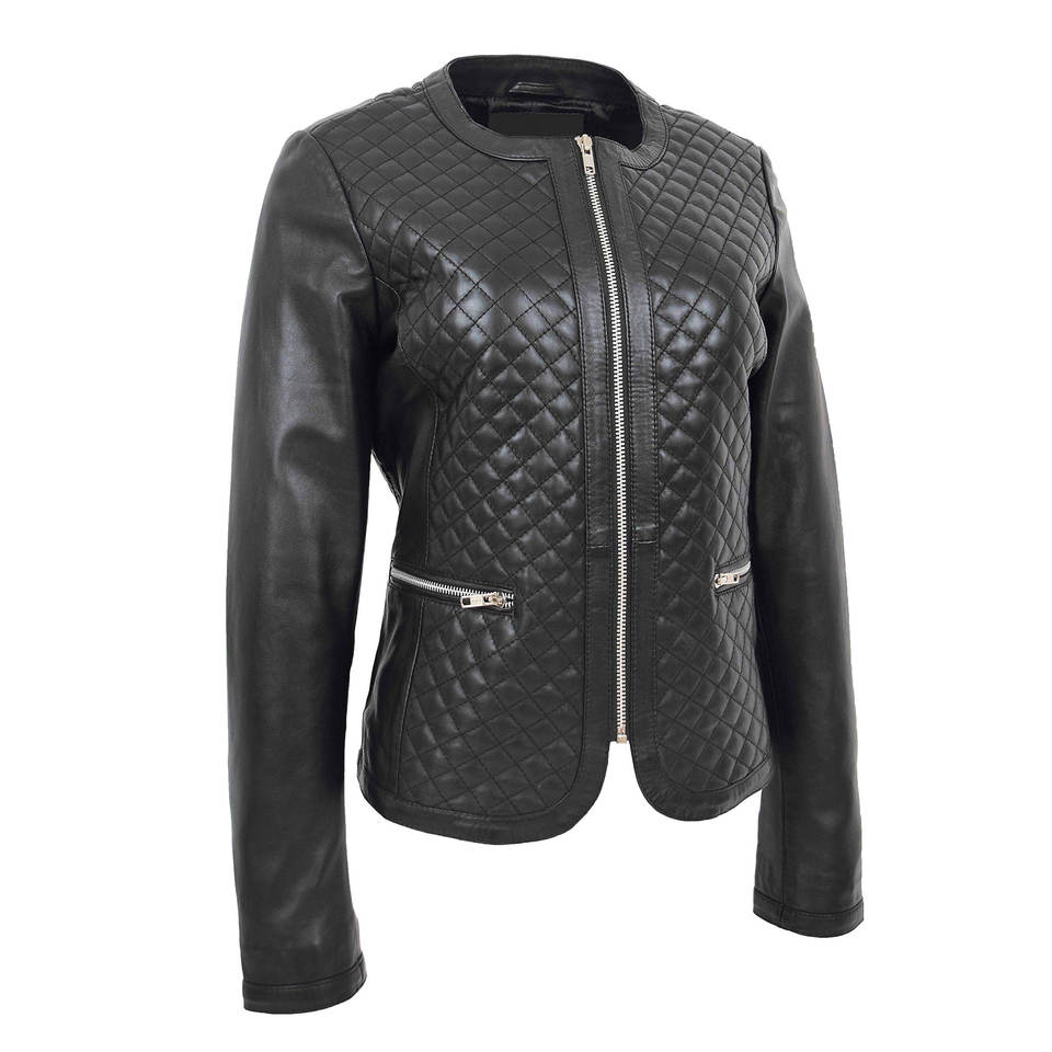 Veste en cuir souple pour femme avec logo personnalisé, sans col, design matelassé décontracté, veste en cuir noir tendance