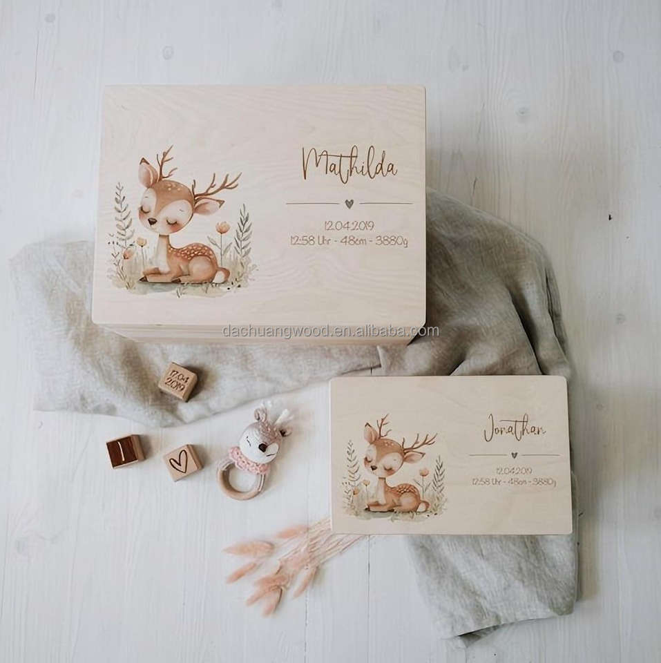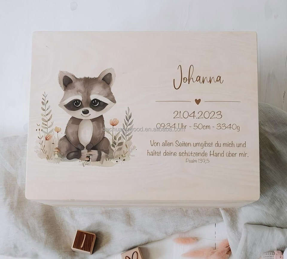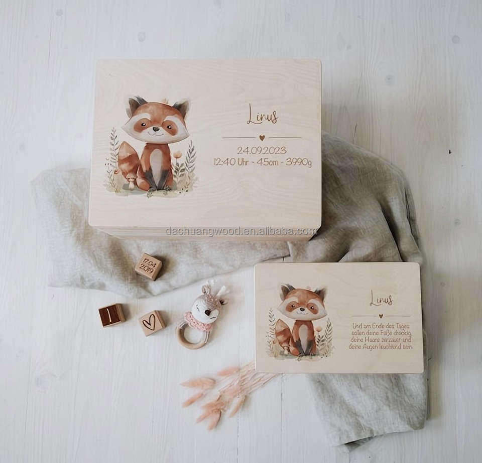 Boîte à souvenirs personnalisée en bois de bouleau non traité avec nom Animaux de la forêt mignons pour stocker et décorer Baptême Naissance