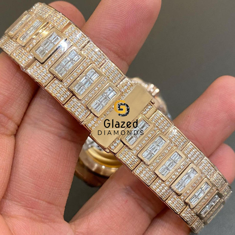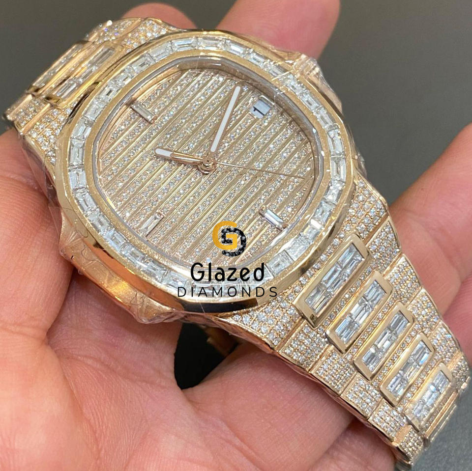 Montre Hip Hop personnalisée pour hommes cultivés en laboratoire avec des diamants taille baguette brillants et étincelants Affichage analogique du cadran en verre