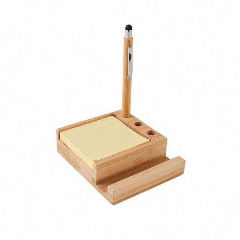 Organisateur de bureau en bambou fait main, moderne, recyclable et personnalisé, avec support pour téléphone, porte-stylos et espace pour notes autocollantes - pour usage au bureau