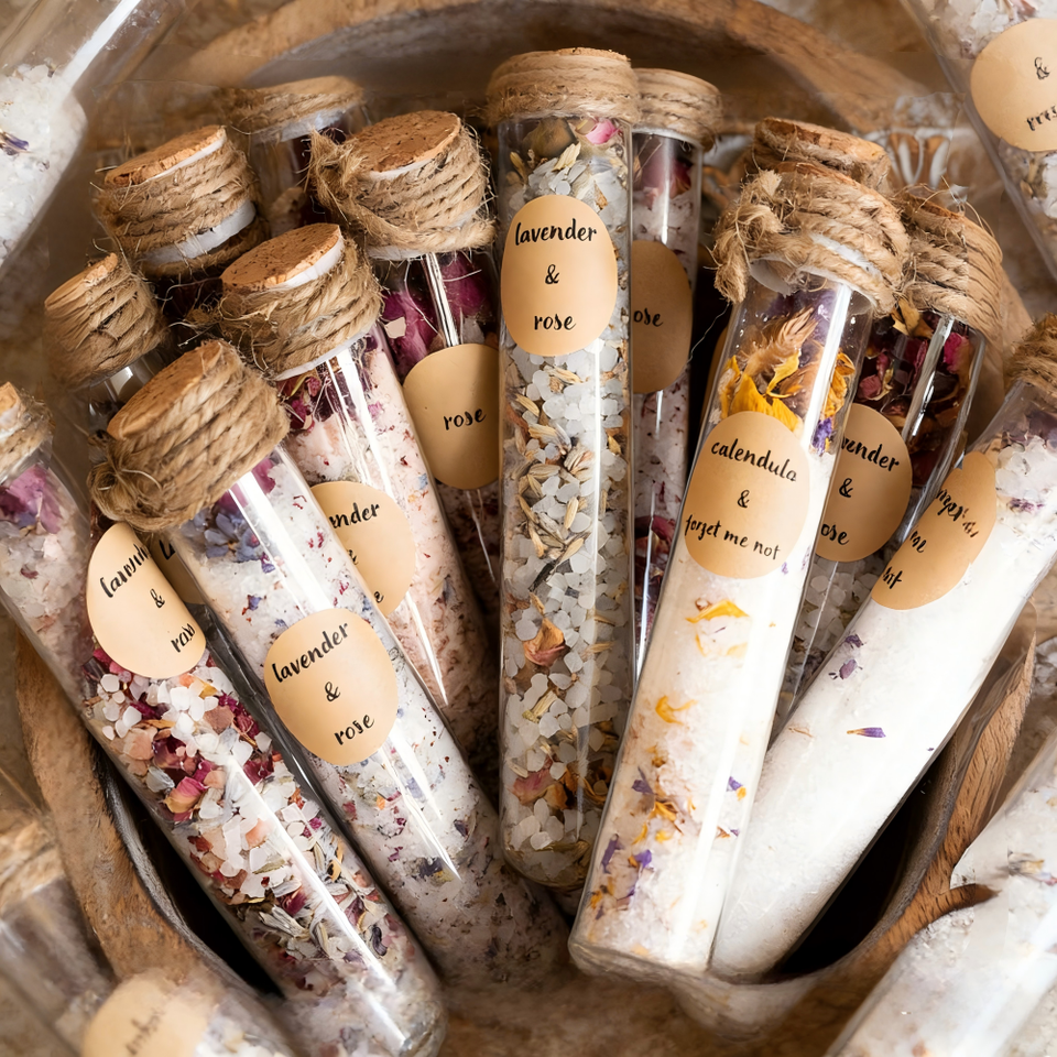 Sels de bain de l'Himalaya, Sels de bain de la Mer Morte, Sel d'Epsom, fleur séchée, Huiles essentielles