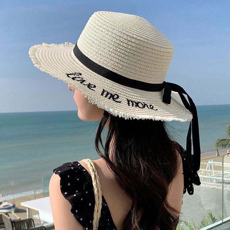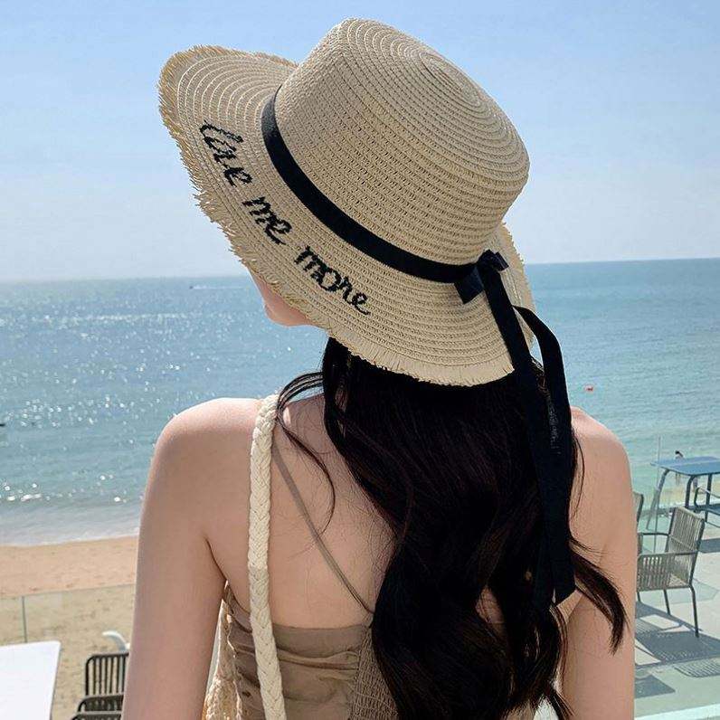 Chapeau de paille personnalisé imprimé à bord plat, brodé, décontracté pour les vacances à la plage, chapeau de soleil à large bord tendance
