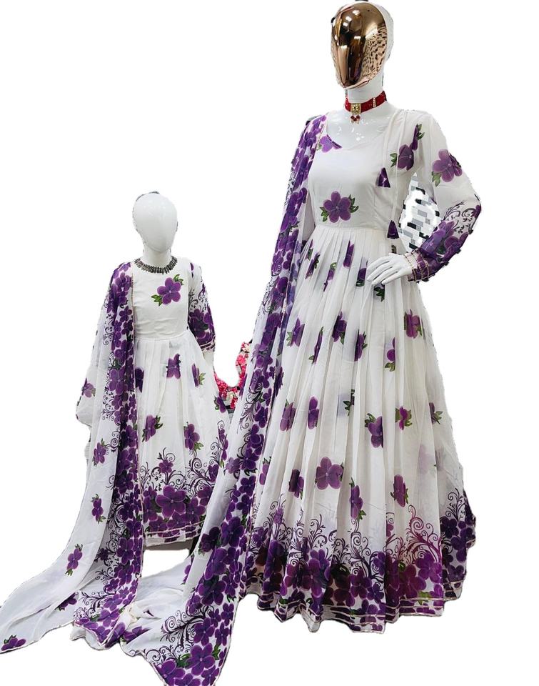 Robe de créateur personnalisée violette en fausse fourrure régulière Dupatta ensemble mère-fille maternité pousses robe de fille fête moderne