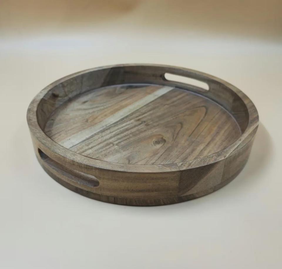Plateau de service rond en bois personnalisé, vaisselle rustique avec poignées, décoration de table basse, accent de style ferme pour la maison