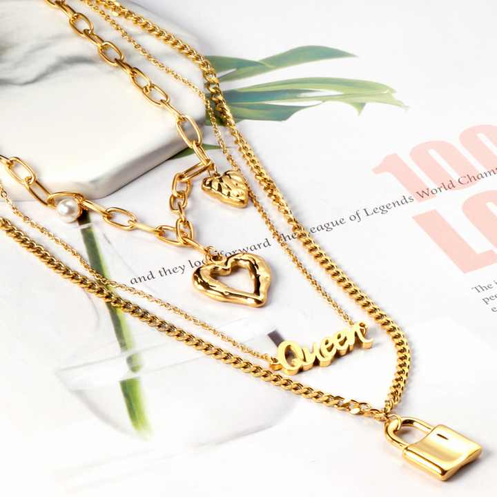 Collier personnalisé en acier inoxydable plaqué or à trois couches avec pendentif cœur pour femme