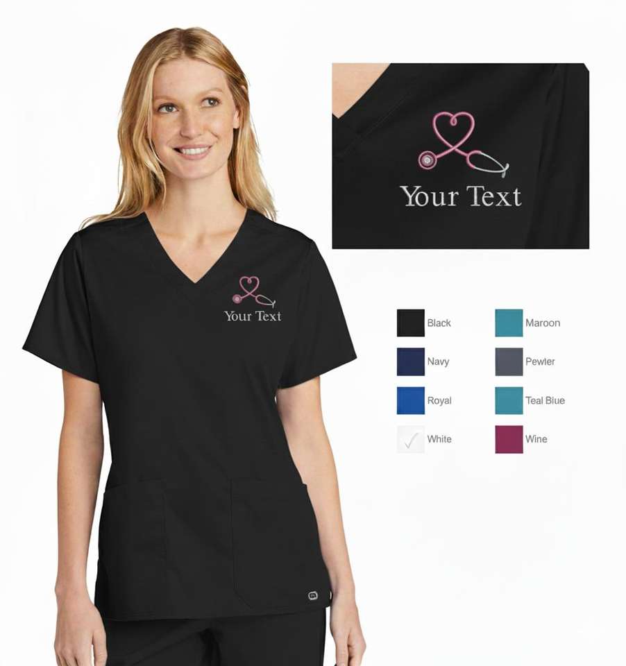 Blouse médicale personnalisée à col en V pour femmes avec broderie personnalisée en forme de cœur de stéthoscope