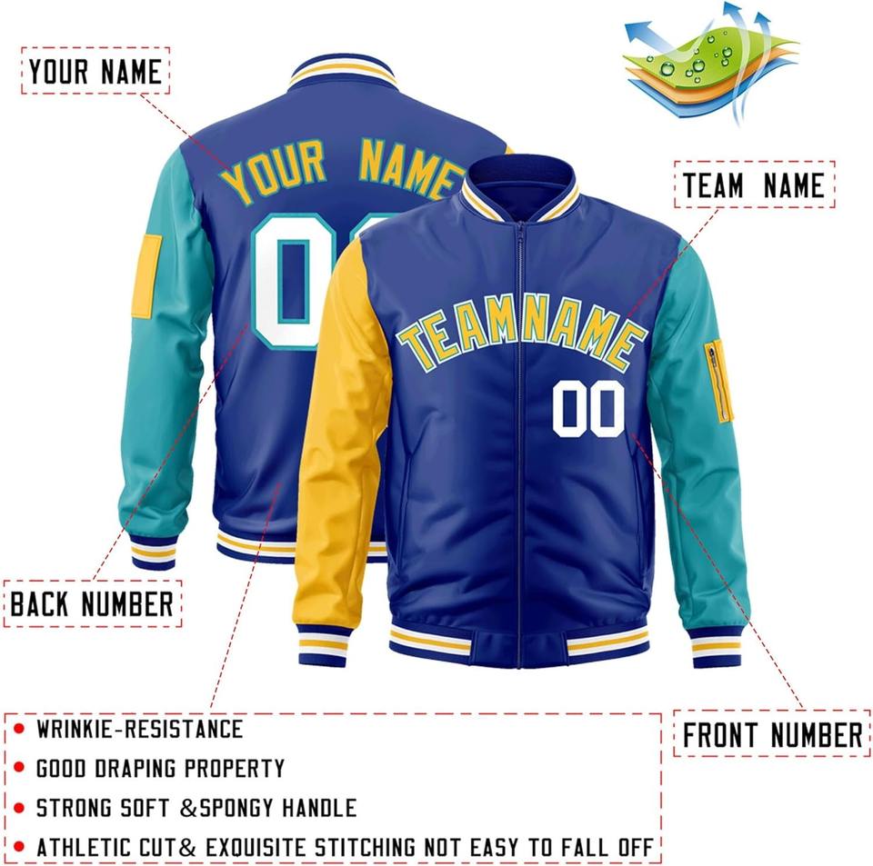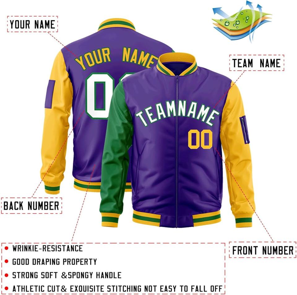 Blouson universitaire personnalisé Bomber zippé avec poche zippée sur le bras gauche Broderie de couleurs contrastées Nom de l'équipe personnalisé Numéro Letterman