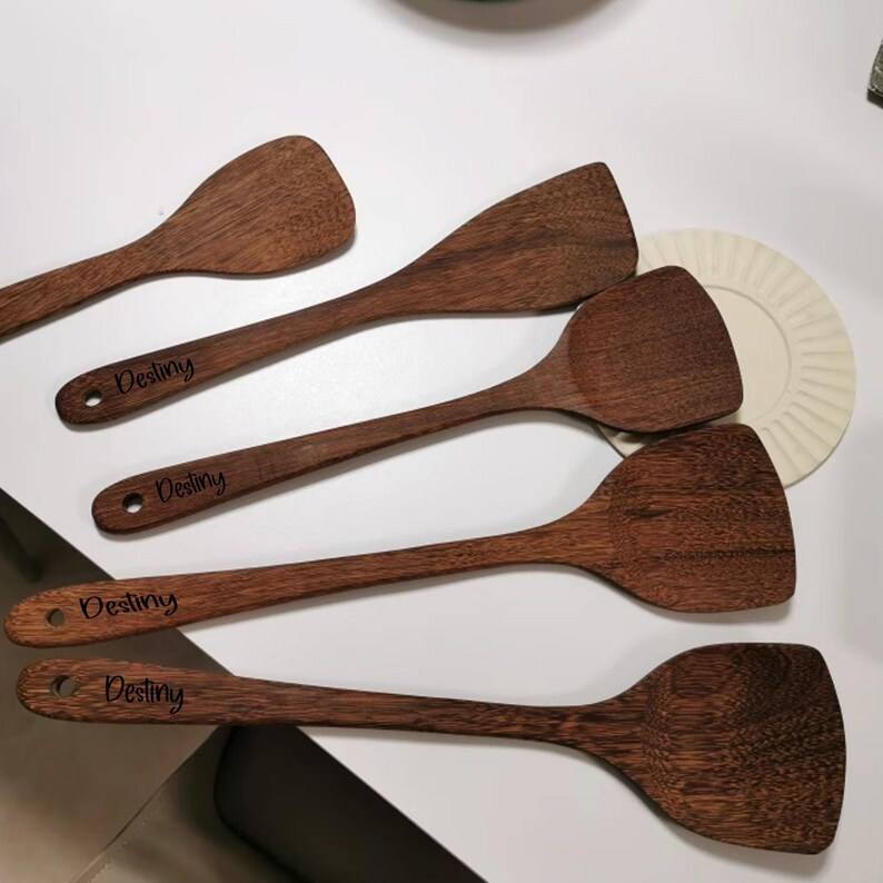 Spatule de cuisine moderne en bois de wengé personnalisée, gravée sur mesure, résistante au lave-vaisselle, avec couleur personnalisée