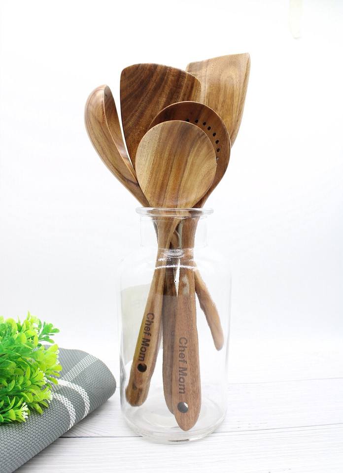 Ensemble d'ustensiles de cuisine en bois personnalisés, cuillères gravées, spatule, passoire, vaisselle