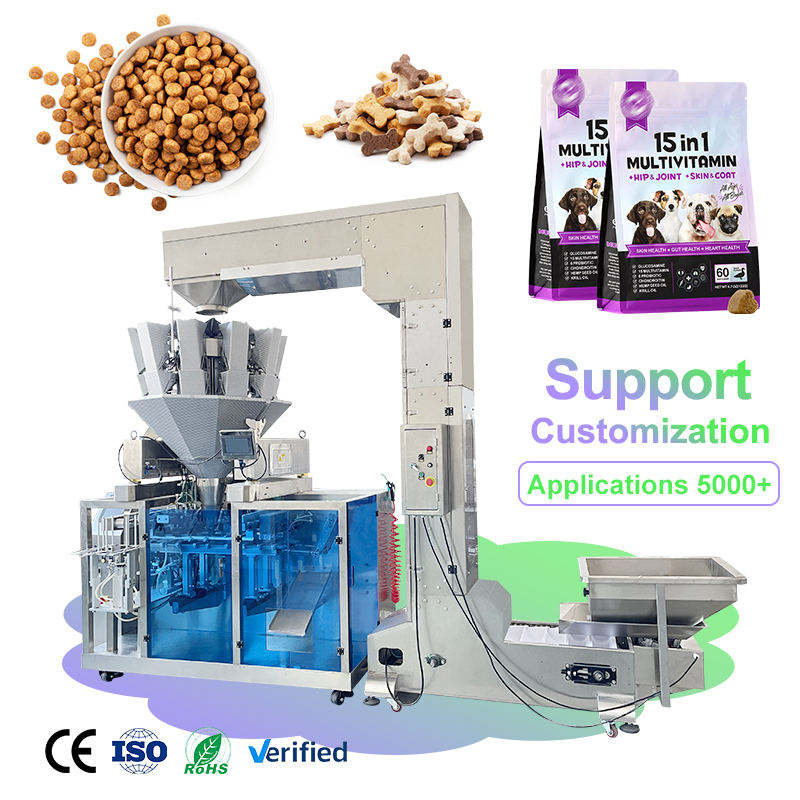 Machine d'emballage pour aliments pour animaux, ligne de remplissage et de scellage automatique de sachets préformés pour aliments secs, granulés et croquettes pour chats et chiens, petits sachets