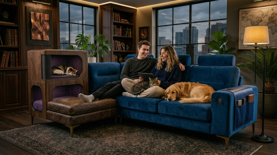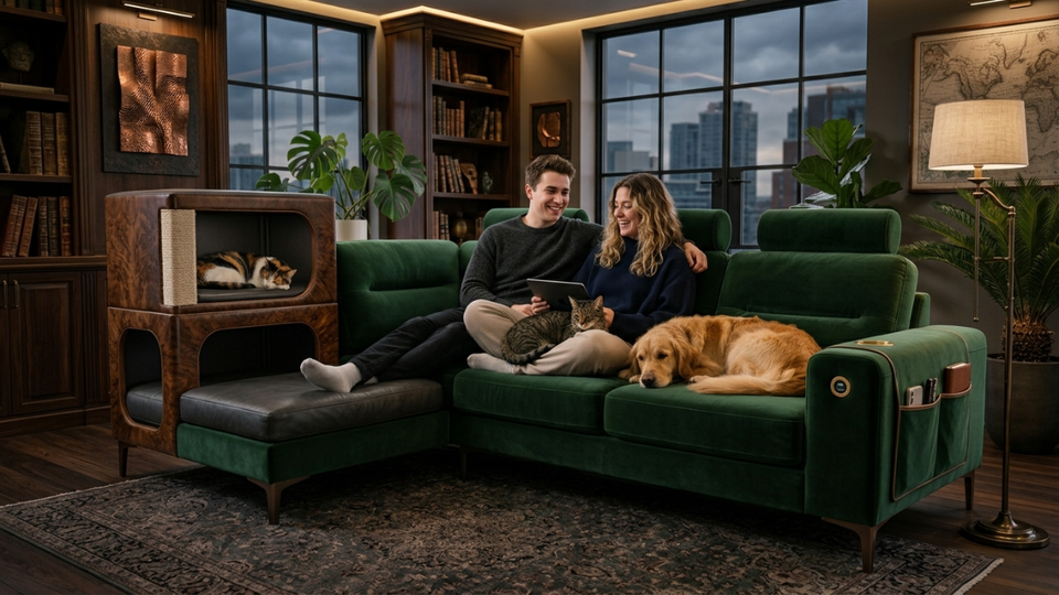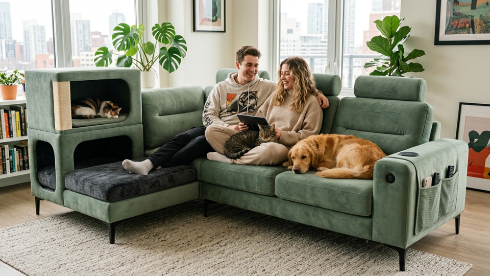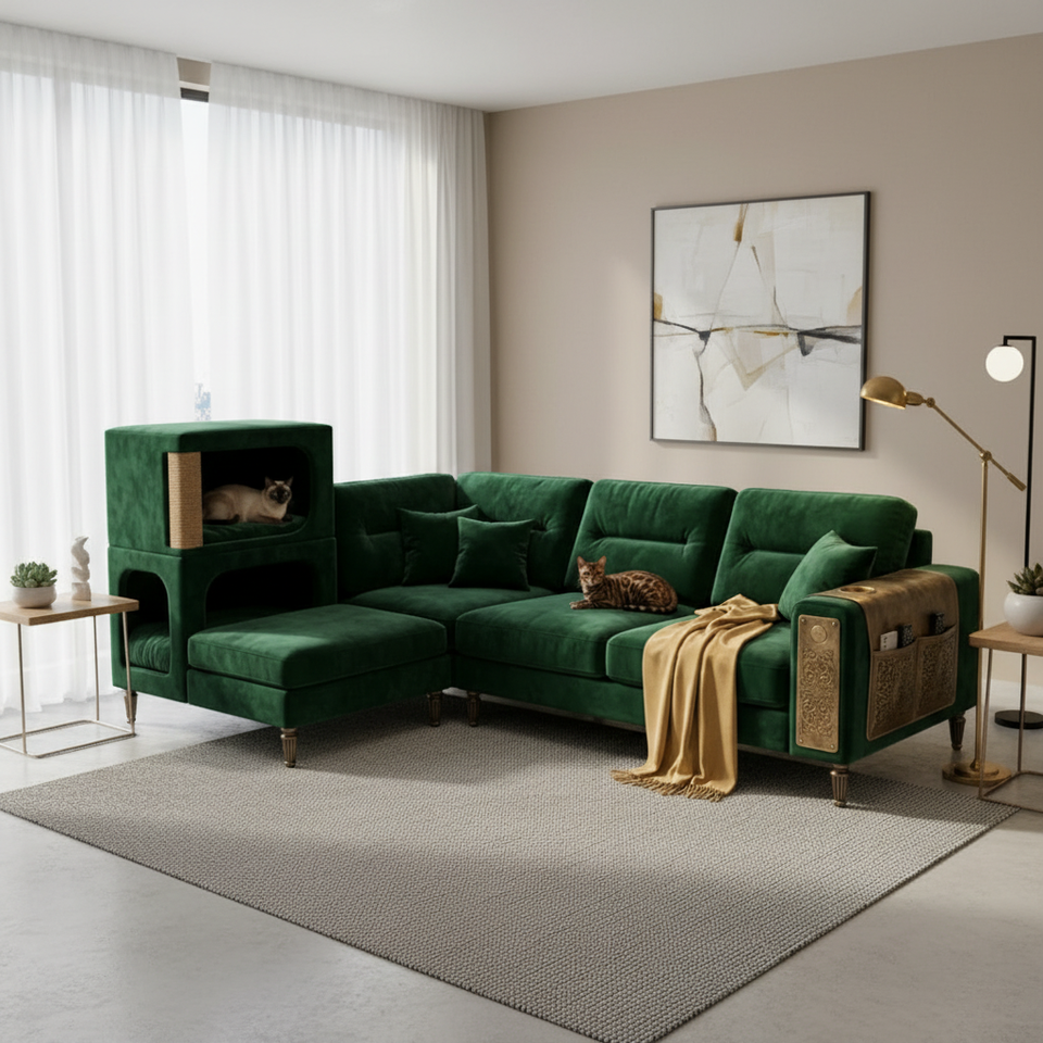 Canapé modulable pour animaux de compagnie avec niche intégrée pour chat, tissu résistant aux griffures, canapé familial moderne pour propriétaires de chats et de chiens