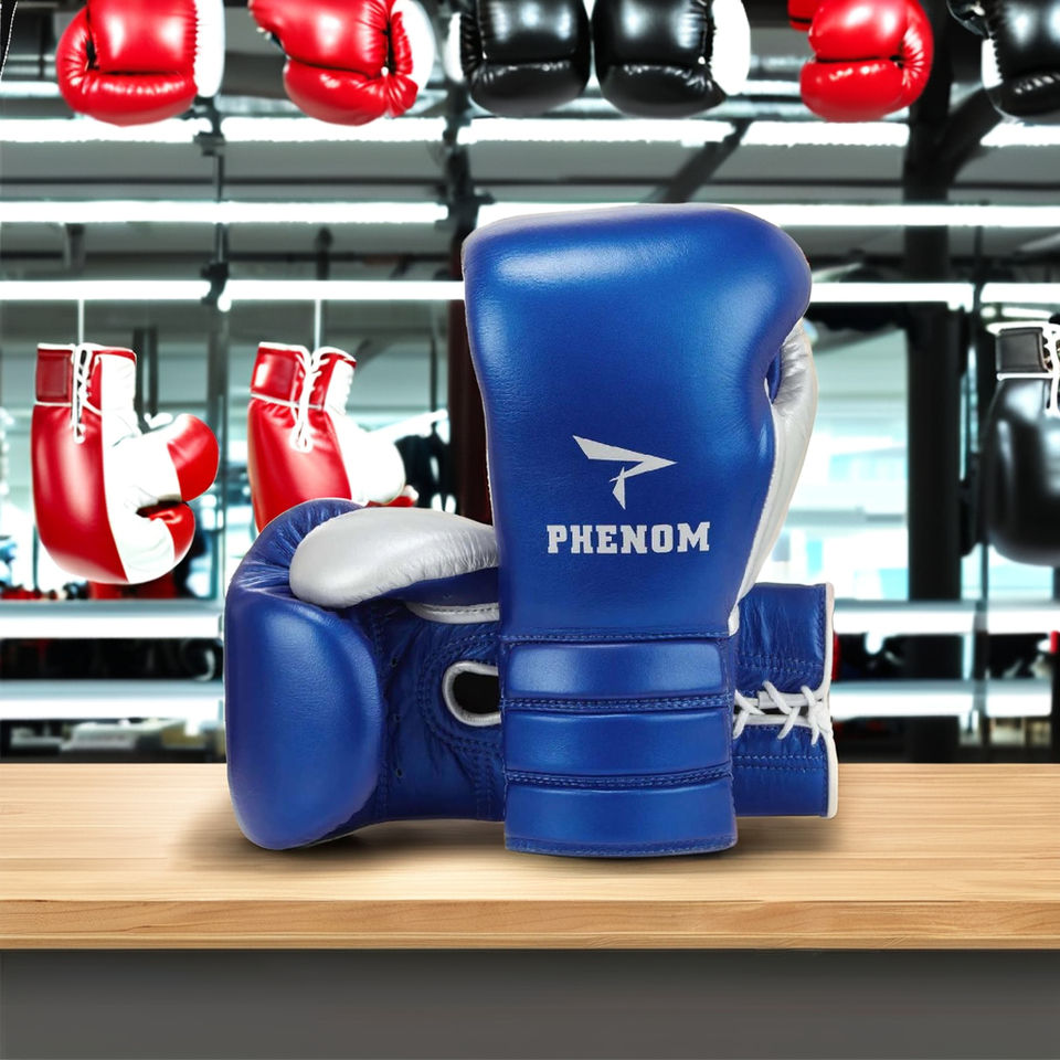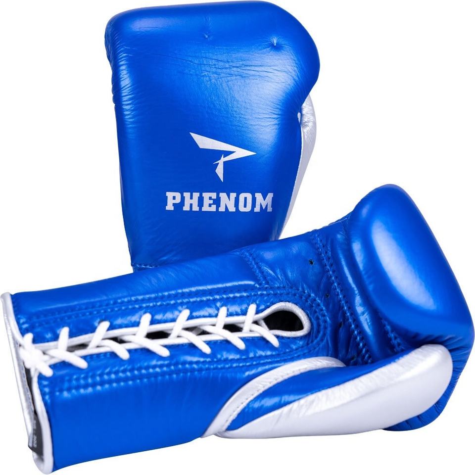 Gants de boxe Phenom, bleu métallisé/argent, à lacets, pour sparring, logo personnalisé OEM, gants de boxe pour arts martiaux, gants de boxe pour adultes