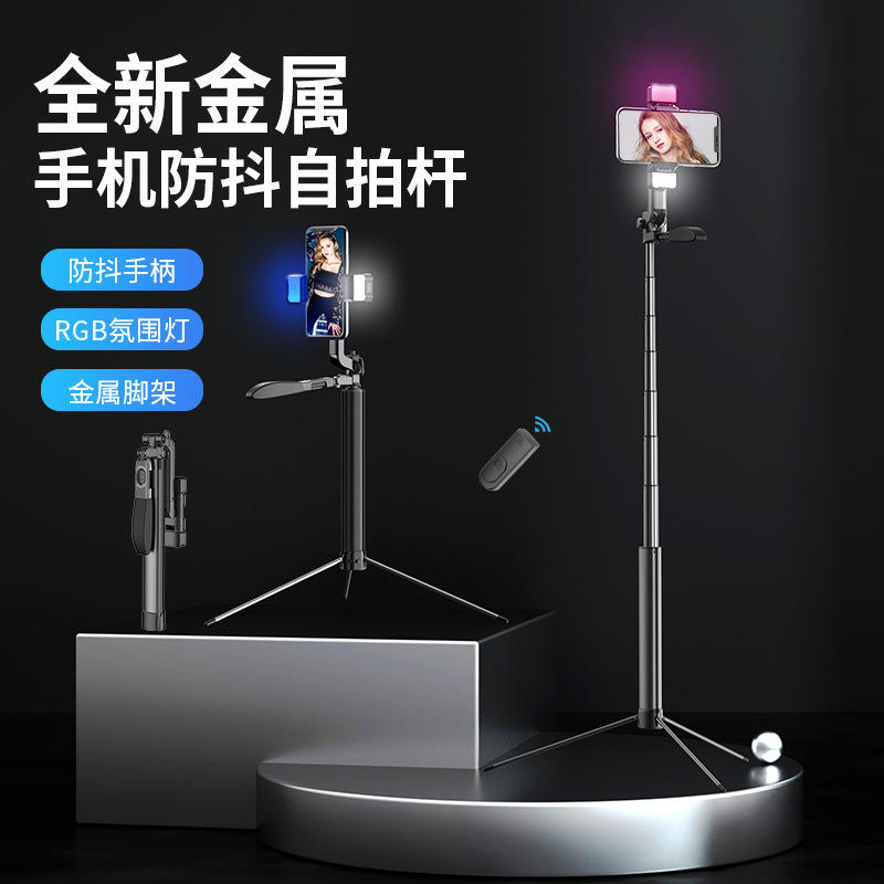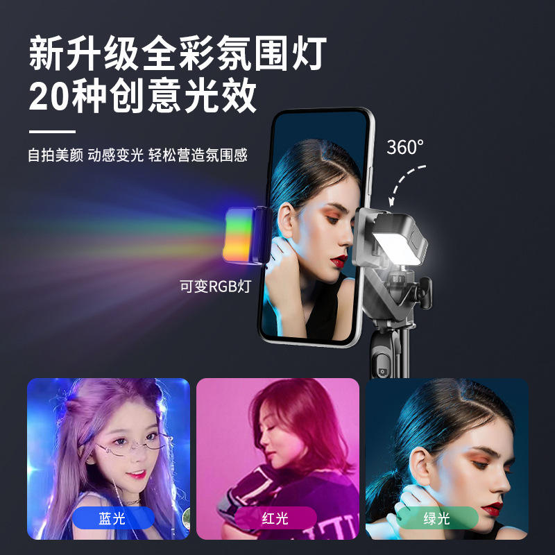 Perche à selfie sans fil avec double éclairage, stabilisateur portable, trépied télescopique pour diffusion en direct