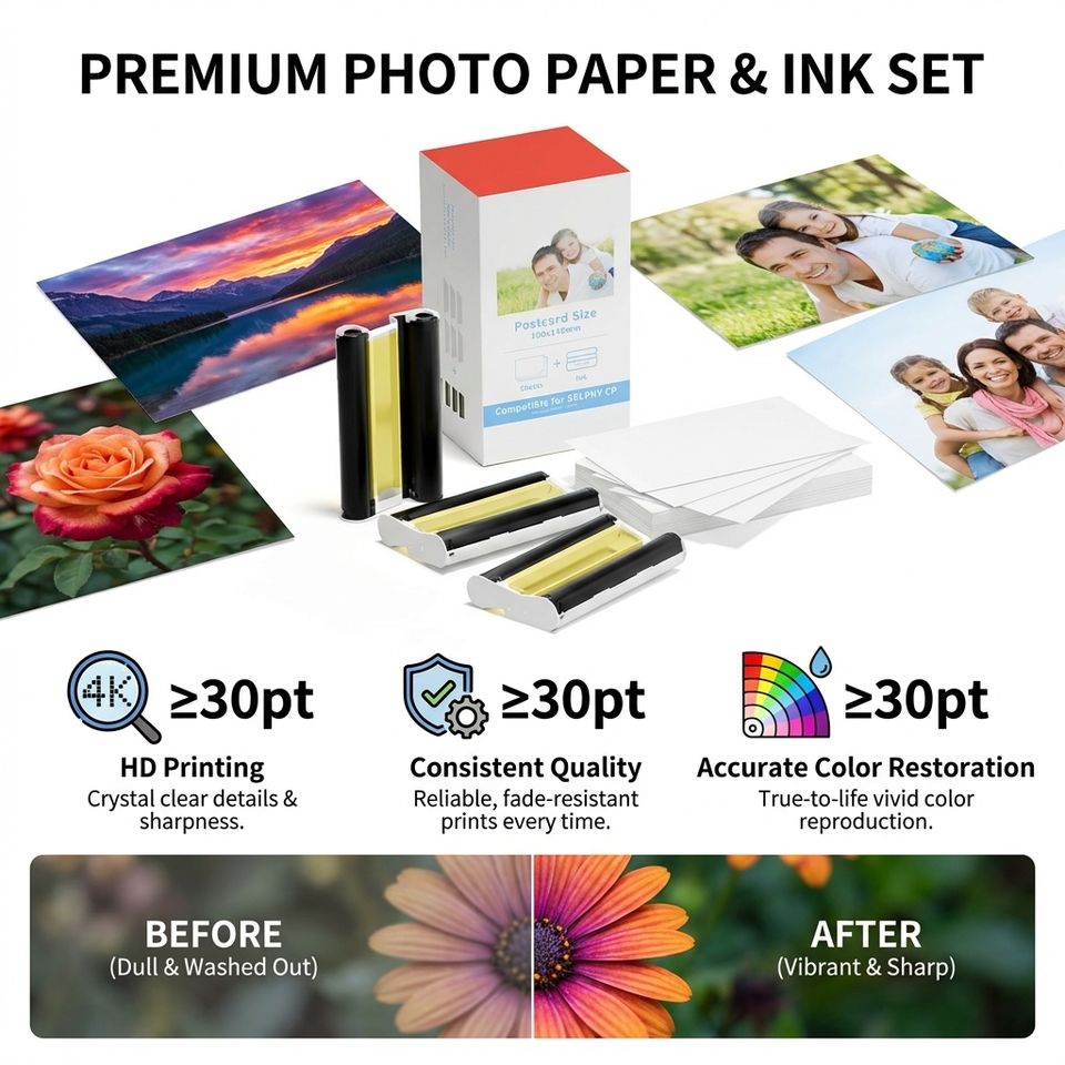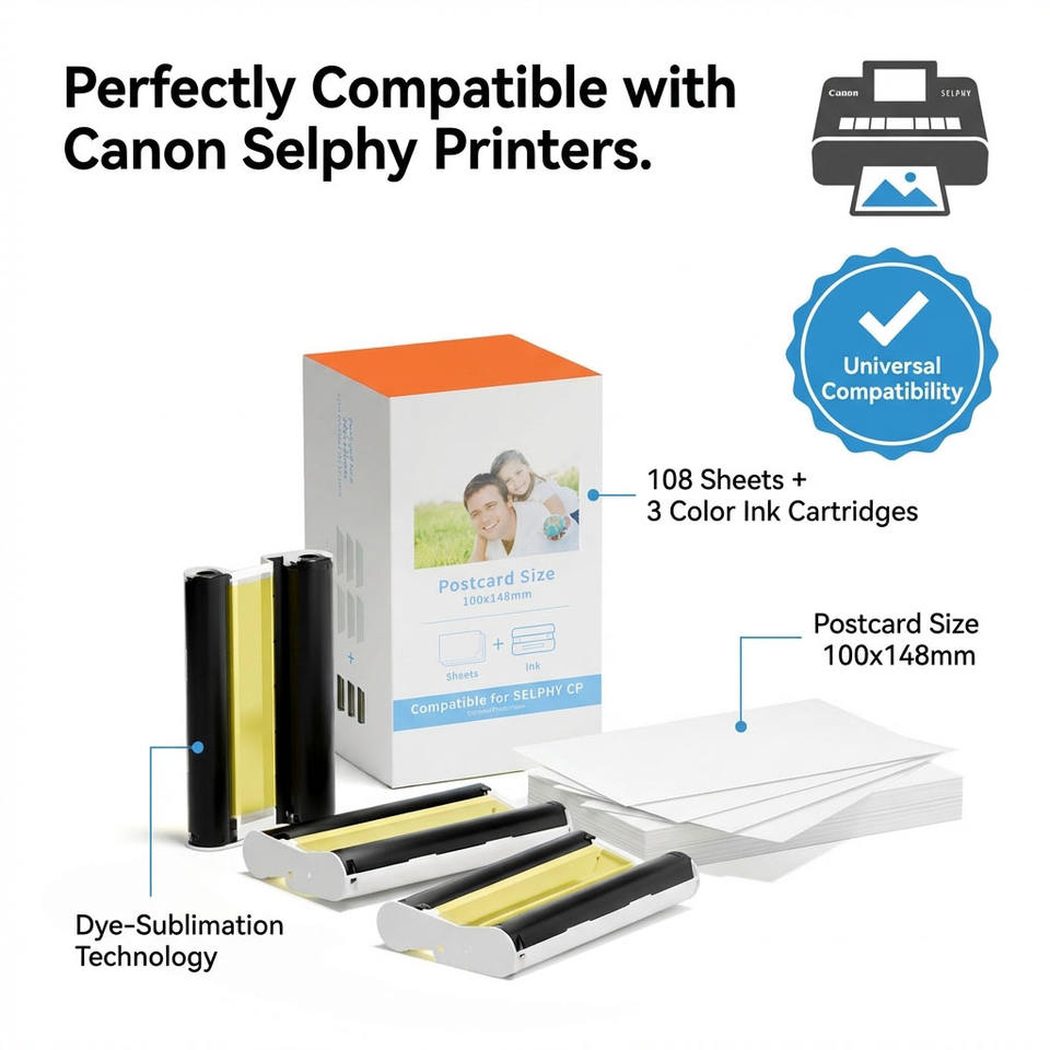 Papier photo compatible avec les cartouches d'encre Canon Selphy CP1300 CP1200 CP910 CP900 CP810 CP800 CP780 CP760 CP720 CP1500 KP-108in