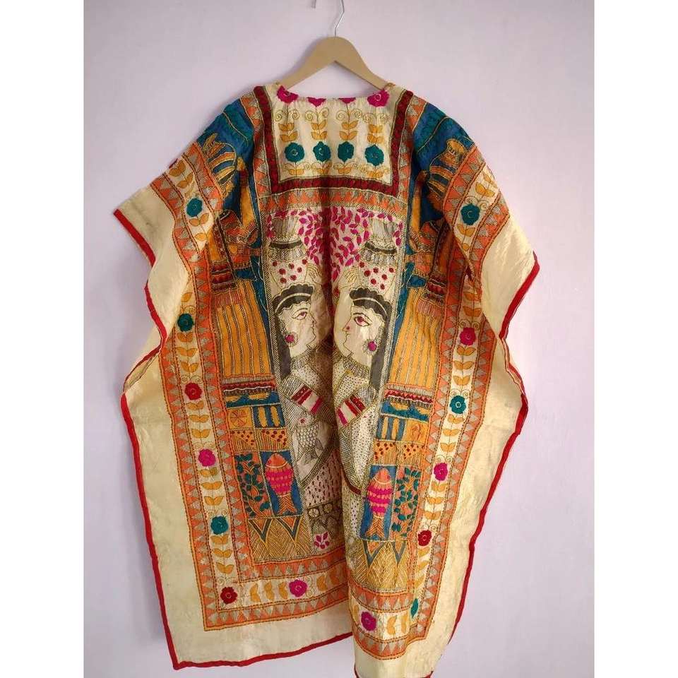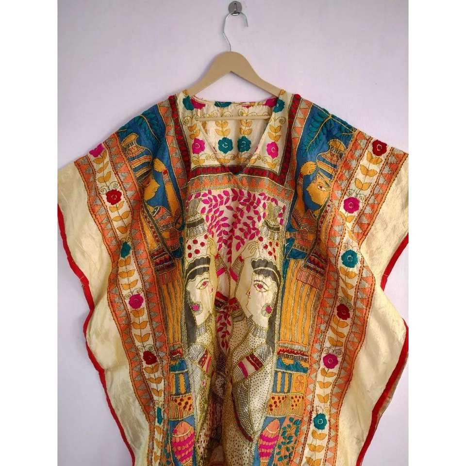 Kaftan Kimono Bohème en Soie Chanderi Brodé Phulkari, Modèle ETH-203, Robe Ample, Cache-maillot de bain pour Femme, Artisanat Ethnique Indien