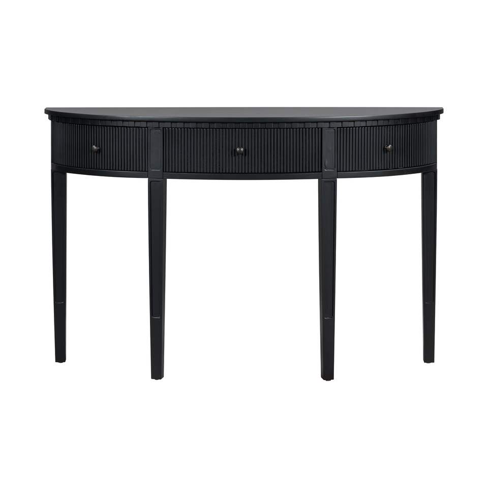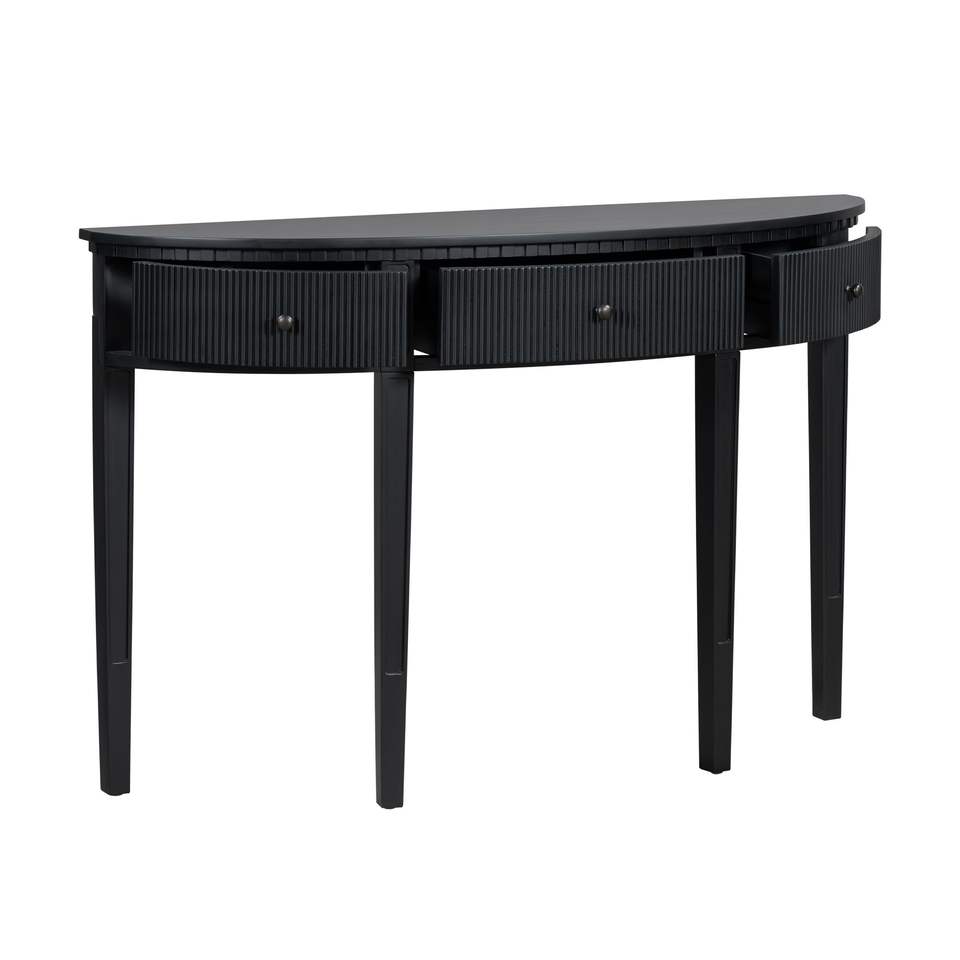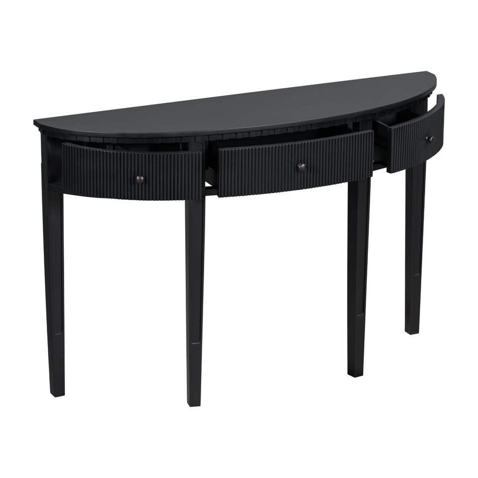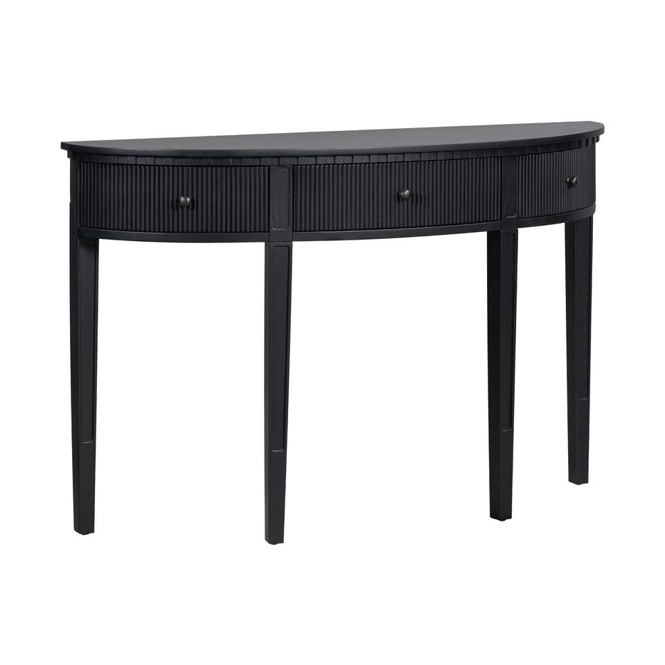 Table console en placage de pin avec quatre pieds distinctifs et façades de tiroirs à rayures verticales