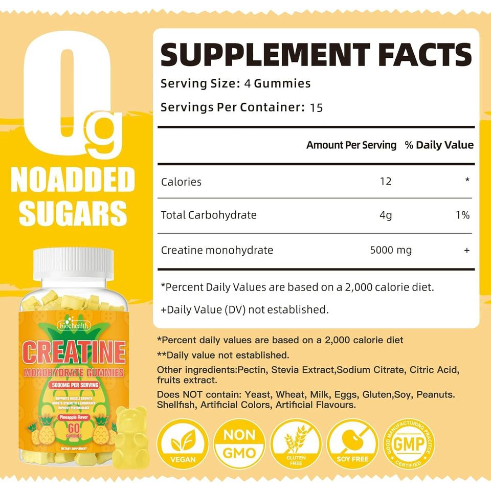 Gummies à la Créatine Aromatisées à l'Ananas, Gummies de Créatine Monohydrate, Compléments Musculaires pour Femmes et Hommes pour l'Exercice