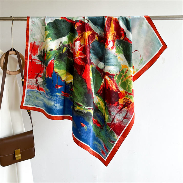 Mots-clés:Foulard en satin 100% soie avec impression numérique personnalisée pour hijab et bandana de marque.