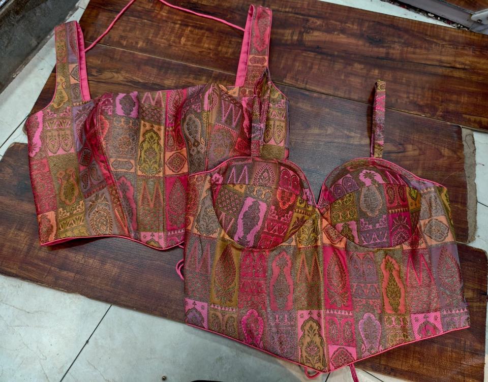 Blouse de sari de mariage style corset en brocart tissé rose avec patchwork, col cœur, sans manches, avec bonnets rembourrés, collection Printemps/Été
