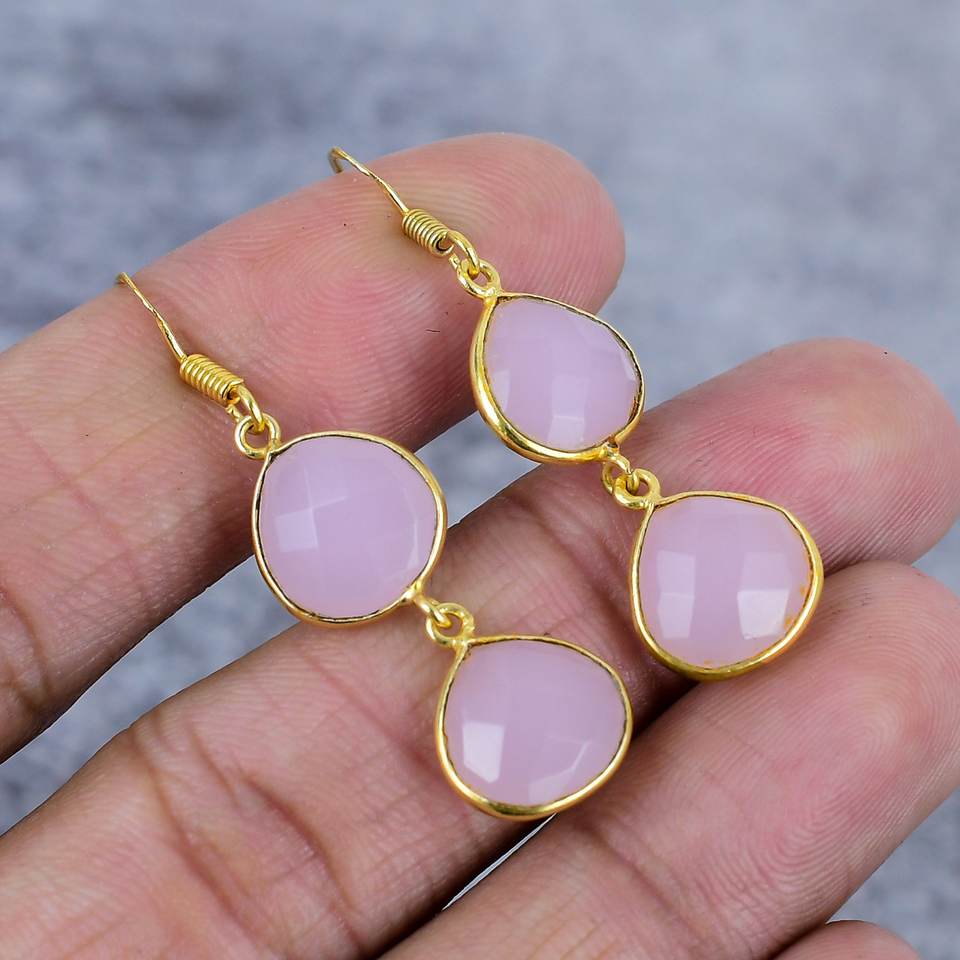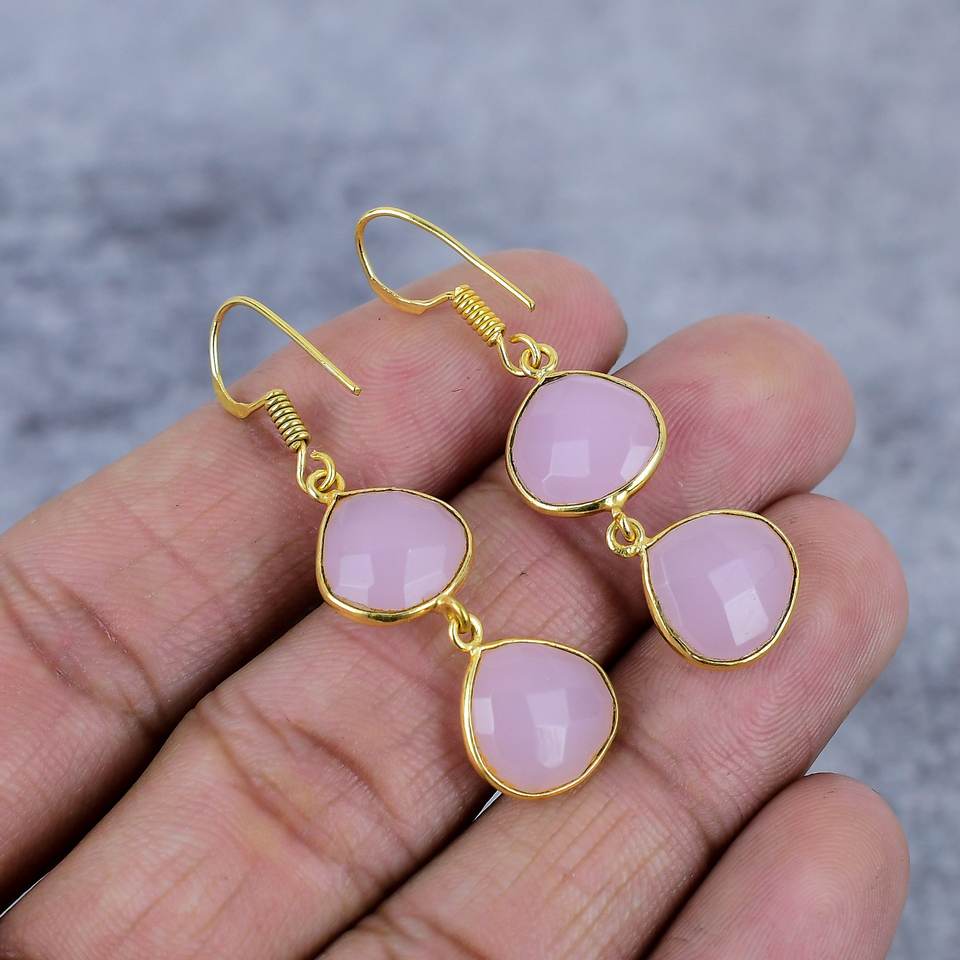 Boucles d'oreilles pendantes en argent sterling 925 faites à la main en calcédoine rose délicate coeur pierre précieuse plaqué or pour les fêtes de mariage