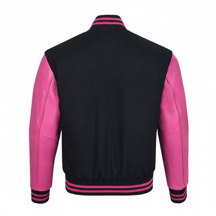 Veste de baseball en cuir rose avec laine noire Vêtements pour hommes Vestes universitaires OEM Fabriquées sur mesure Vêtements de sport de haute qualité Adultes