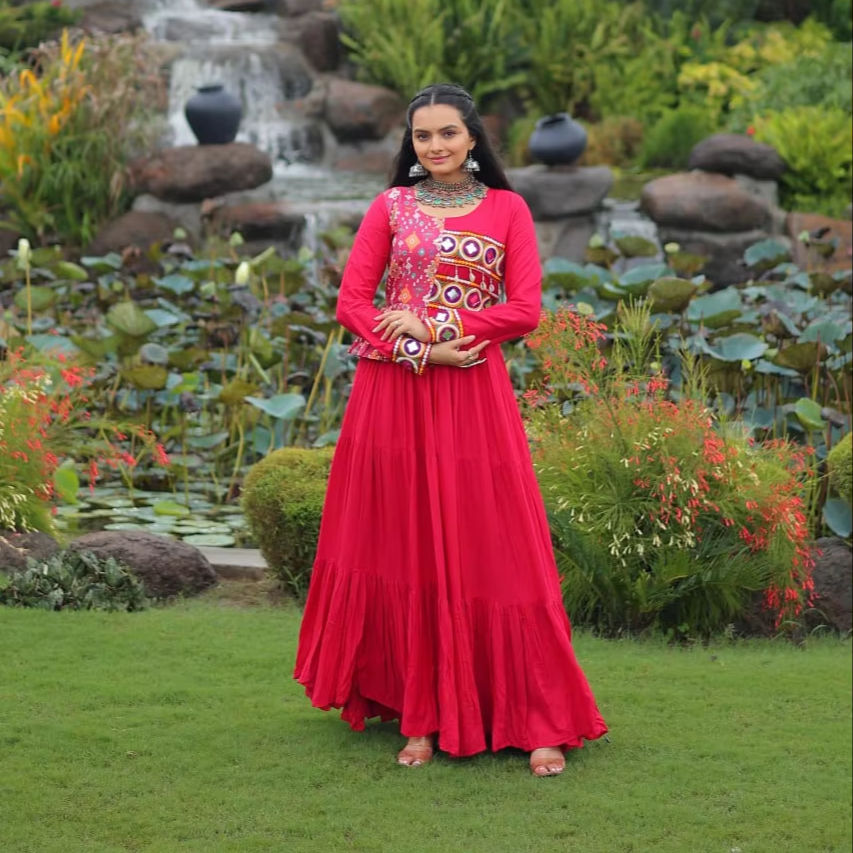 Robe en coton imprimé rose travail brodé attrayant Reyon Kutchi Gamthi Collections spéciales pour Navratri indien pakistanais