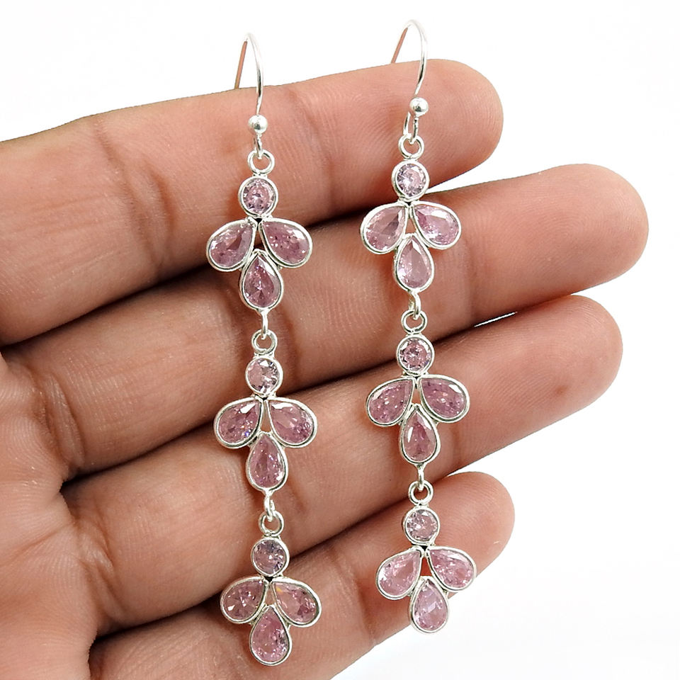 Zircon cubique rose forme de goutte longue balancent 925 argent Sterling lunette ensemble boucles d'oreilles déclaration conception bijoux pendants pour les femmes