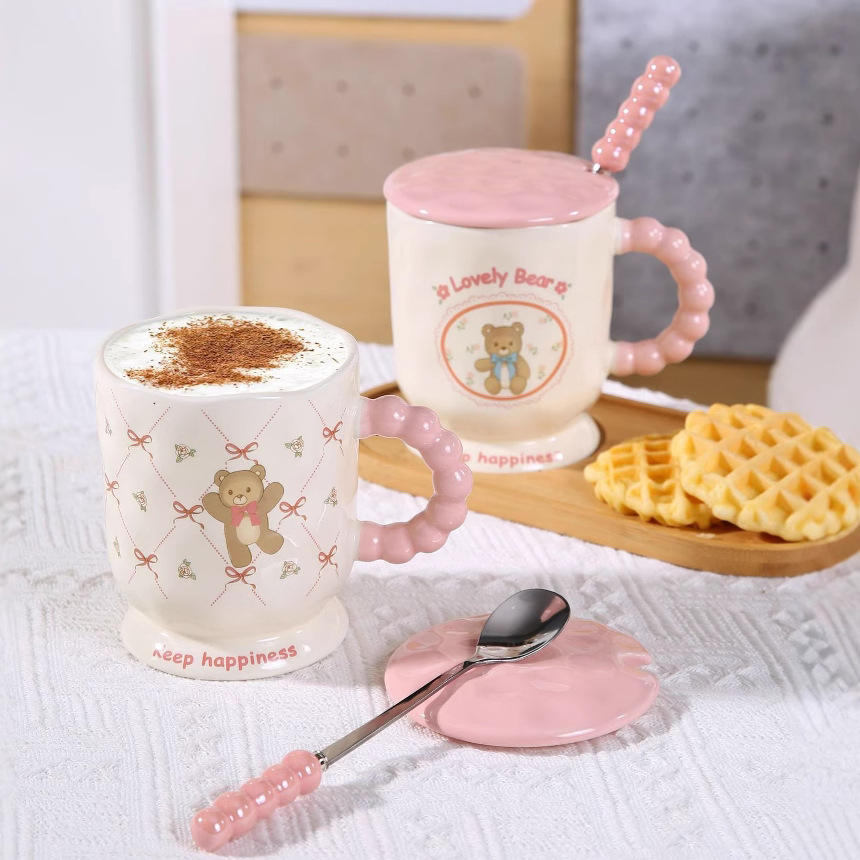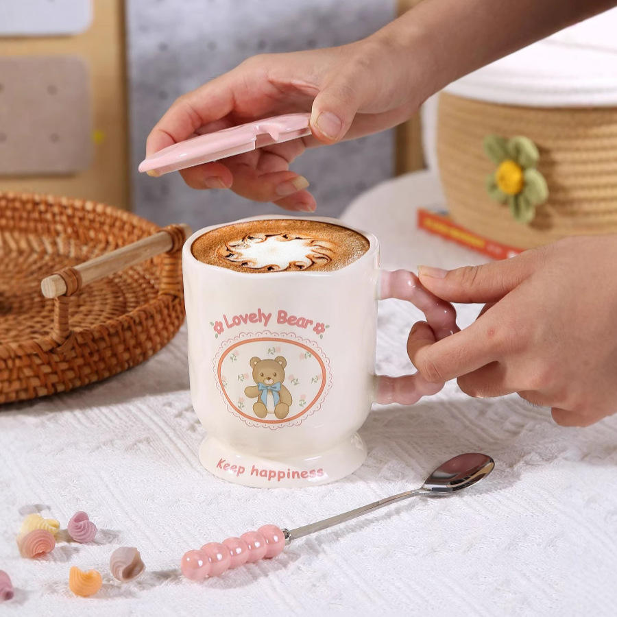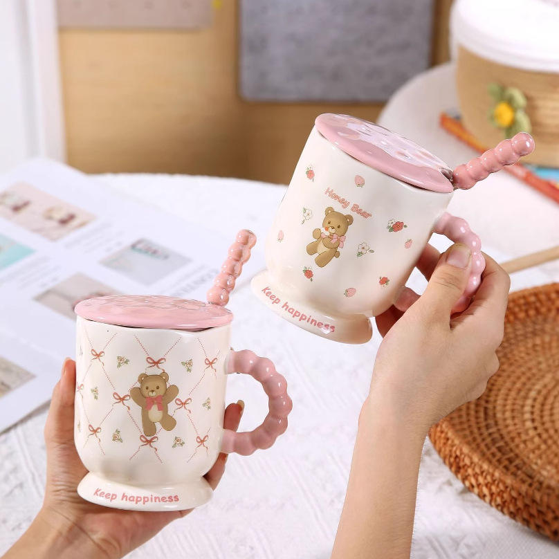 Tasse en céramique ours mignon rose avec couvercle et poignée de perle cuillère tasse coeur girly tasse bureau après-midi tasse à thé