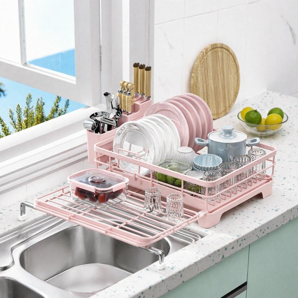 Égouttoir à vaisselle rose extensible avec plateau, réglable, coulissant pour évier et comptoir, grande taille