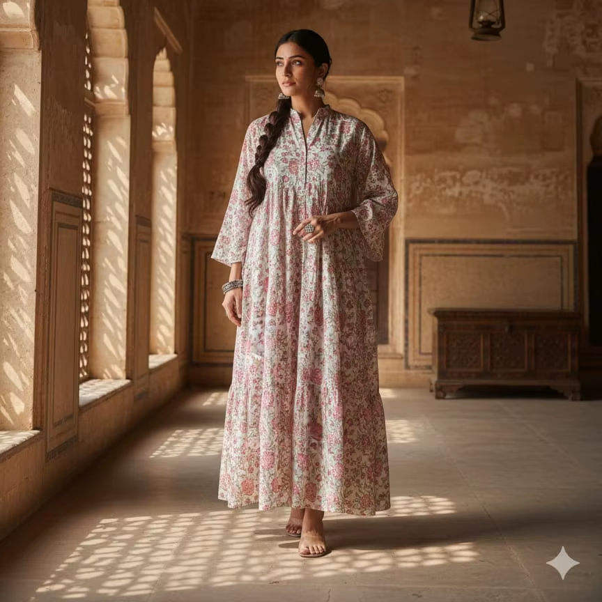 Kaftan long midi en coton rose à imprimé floral, style bohème à volants, pour femme, mode ethnique indienne festive, coupe trapèze