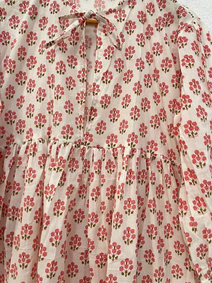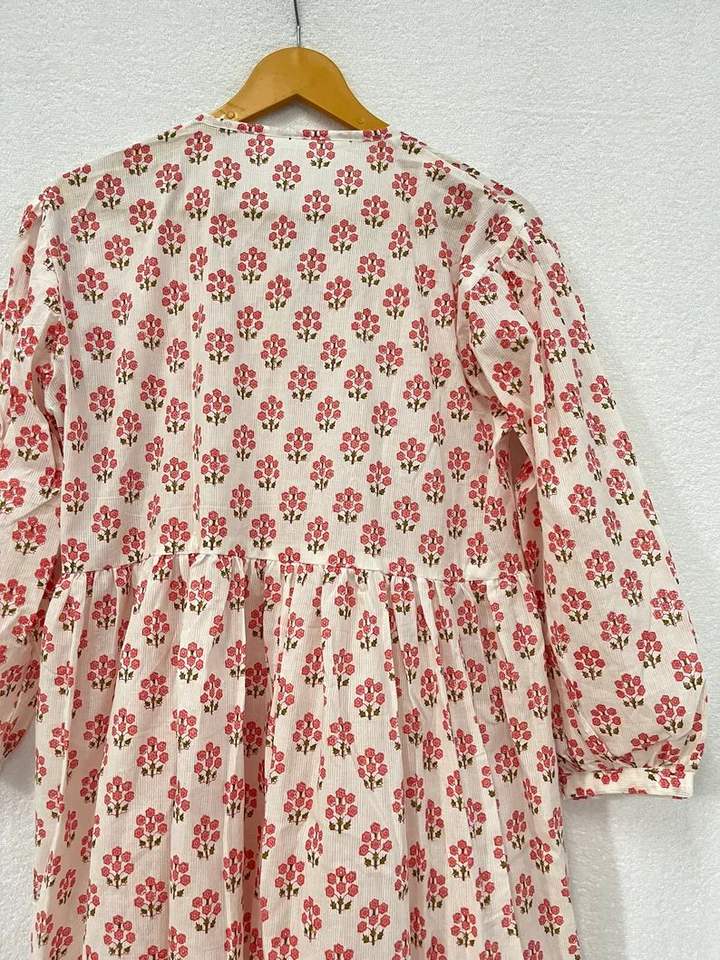 Confortable à manches longues rose Floral bloc imprimé femmes ample longue robe d'été naturel Kurti robe une pièce