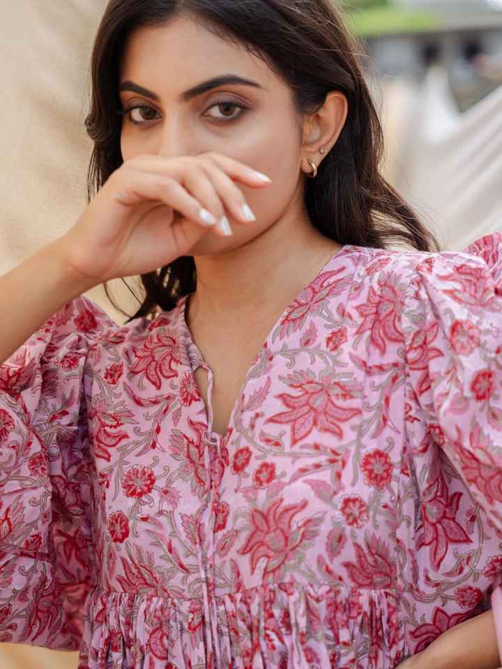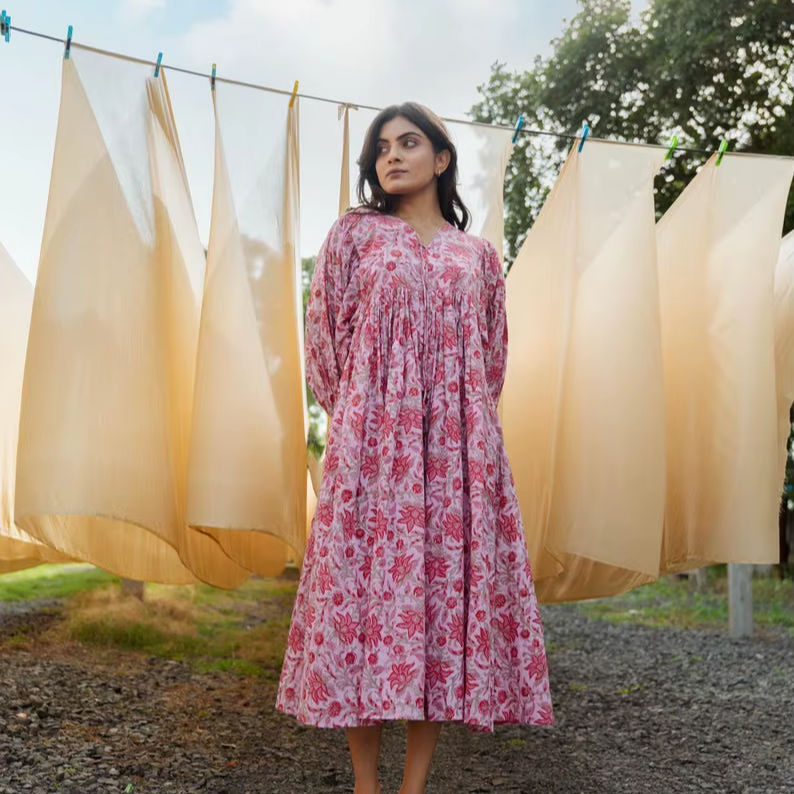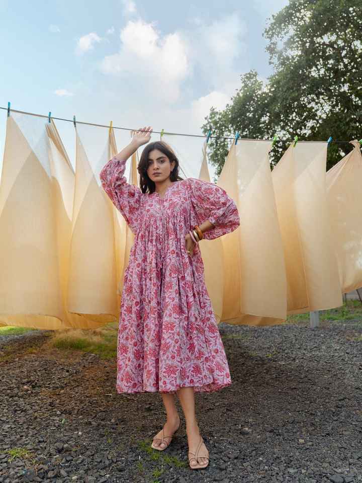 Robe midi en coton à fleurs roses, imprimée à la main, style bohème, robe d'été, tenue de tous les jours, tenue de détente, cadeau pour elle