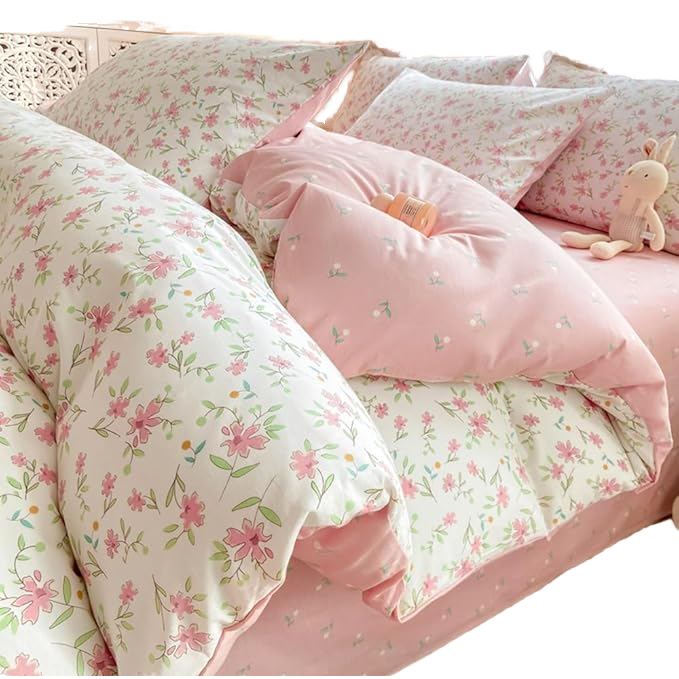 Pink Floral Fitted Sheet Set 300tc Cotton Soft Breathable 3D Reversible Cute Eco-Friendly Water Resistant European Bedding
