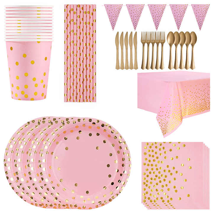 Vaisselle Jetable Rose Doré Estampillée : Assiettes, Gobelets et Serviettes – Kit de Fête et Vaisselle